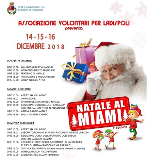 Anche nelle periferie della città si accende il Natale. Da ieri ha preso vita nei giardini pubblici di viale Europa il villaggio di Natale promosso dall’associazione. La manifestazione, resa possibile grazie anche alla partecipazione di diverse realtà del territorio, si snoderà in una serie di iniziative che allieteranno le mattine e soprattutto i pomeriggio dei più piccini. E non mancherà nemmeno l’appuntamento con Babbo Natale fissato per questo pomeriggio a partire dalle 16.30. L’iniziativa vedrà anche la partecipazione di diversi cori che metteranno a disposizione la loro “voce” per allietare i pomeriggio. Oggi alle 15.30 toccherà al coro dell’Istituto comprensivo Ilaria Alpi diretto dal maestro Alessandro Borghi, mentre domani alle 15 in programma l’esibizione dell’oratorio Don Bosco diretto da Suor Nellina a cui seguirà l’esibizione del coro dell’Istituto Comprensivo Ilaria Alpi Ladispoli 3 di Marina di San Nicola e di via Rapallo. E si proseguirà ancora con laboratori, canti, balli, la tradizionalissima tombolata e tanto altro ancora. Saranno inoltre presenti mercatini di artigianato, stand gastronomici. Quello del ”Natale al Miami” sarà inoltre l’ultimo appuntamento, almeno per il momento, con Toy Story il mercatino dei bambini promosso dal Comitato Cittadinanza Dinamica Ladispoli. I bambini approfitteranno di questo evento per mettere ancora una volta in vendita, proprio come fatto domenica scorsa in piazza Rossellini le loro piccole opere d’arte realizzate con materiale di riciclo.