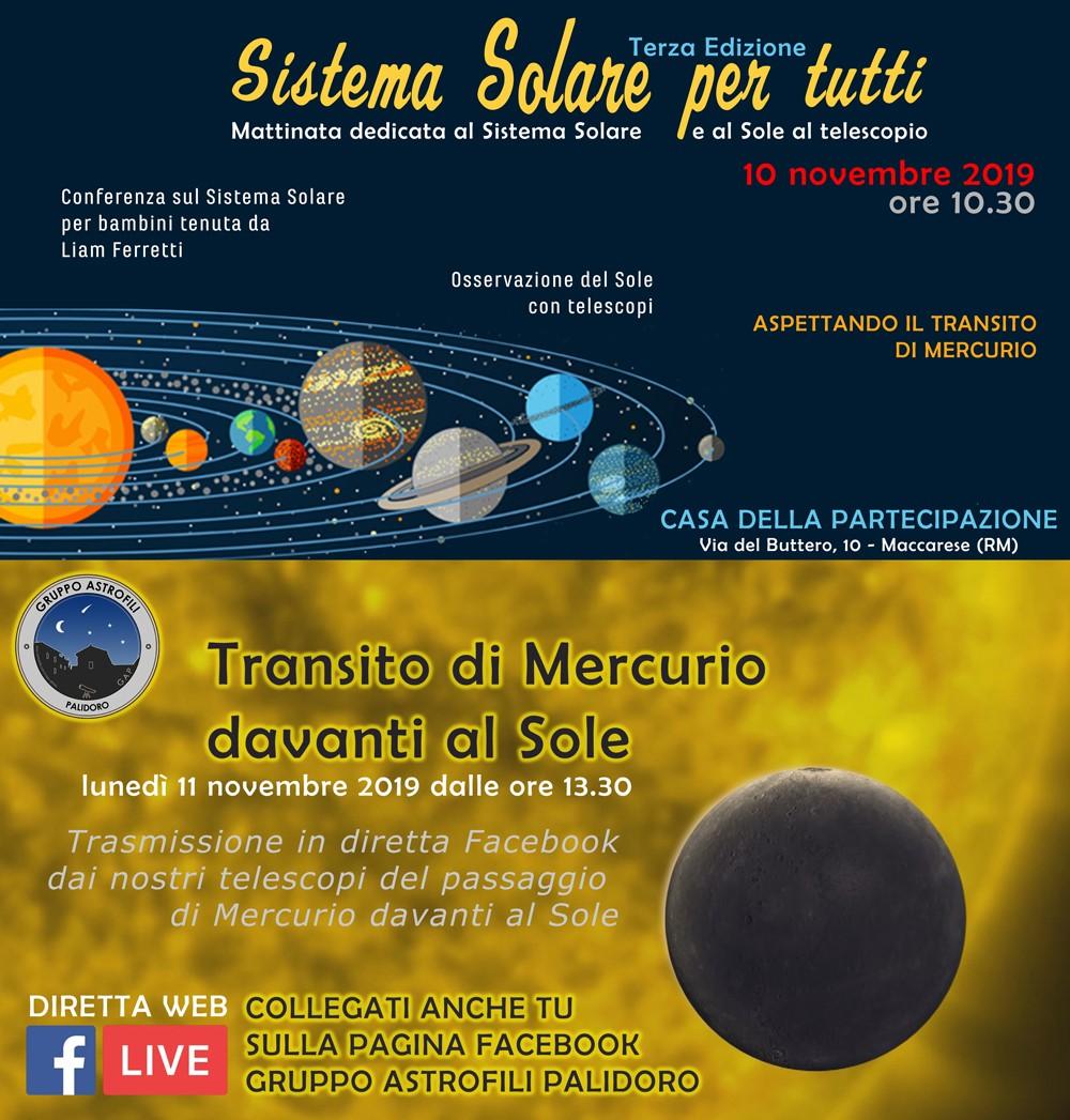 Domenica 10 novembre, dalle ore 10:30 alle 12:30, il Gruppo Astrofili Palidoro presenta “Sistema Solare per tutti”, una mattinata all’insegna della comprensione del nostro “vicinato”, composto da sfere di diversa natura e dimensione che si chiamano pianeti. Il piccolo Liam Ferretti terrà una conferenza sul Sistema Solare, per questo l’incontro è rivolto soprattutto ai bambini. A seguire si potrà osservare il Sole con i telescopi. L’evento, patrocinato dal Comune di Fiumicino, si terrà presso la Casa della Partecipazione a Maccarese (via del Buttero). L’ingresso è gratuito. Lunedì 11 novembre dalle ore 13.30: Transito di Mercurio (Diretta Web). Trasmissione in diretta sulla pagina Gruppo Astrofili Palidoro del raro fenomeno del Transito di Mercurio davanti al Sole. In caso di maltempo la diretta non sarà effettuata. Pagina Facebook https://www.facebook.com/astrofilipalidoro – Info: info@astrofilipalidoro.it – 347.5010985 – www.astrofilipalidoro.it