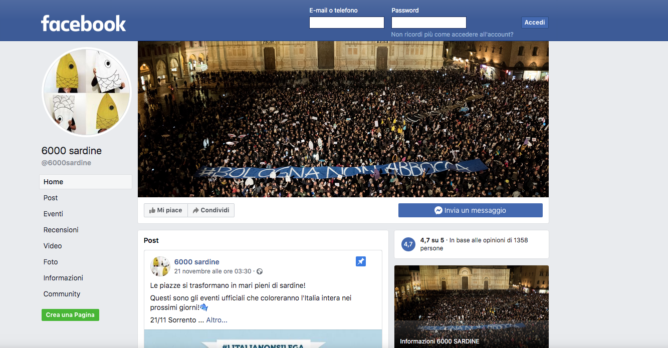 Qualche ora di blocco, poi la pagina Facebook delle ‘6000 Sardine’ è stata ripristinata. Oscurata nella serata di domenica – insieme alla pagina di riserva ‘6000 sardine 2’ -, la fanpage del movimento anti-Salvini è ora nuovamente visibile, anche se al momento non è presente alcun nuovo messaggio da parte degli amministratori. Tanti nel frattempo gli attestati di solidarietà prima del blocco temporaneo, in particolare da altre pagine Facebook che appoggiano le iniziative delle sardine dalla prima, imponente, mobilitazione di Bologna. Fra loro, I ‘Sentinelli’ di Milano e Roma, che non solo hanno lanciato un ‘mail bombing’ per segnalare l’anomalia, ma che hanno anche puntato il dito contro un responsabile ben preciso: “Vi mostriamo – scrivevano nella serata di ieri – cosa stanno facendo nei gruppi salviniani per oscurare le pagine delle ‘sardine'”, allegando al post alcuni screenshot di presunti militanti leghisti impegnati ad organizzarsi per segnalare in blocco le pagine. “Sor Pienipoteri – scrivevano ancora – ha davvero una gran fifa delle piazze pacifiche e democratiche delle sardine. I suoi sgherri digitali, con le loro segnalazioni in massa, basate su nulla che non sia la loro stessa prevaricazione, hanno obbligato l’automatismo di Facebook a oscurare la pagina ufficiale delle sardine. Ci troviamo – accusavano – di fronte a un attacco sistematico quanto vile, tanto che – aperta a tarda sera una seconda pagina di ripiego – è stata fatta subito oscurare anche quella. Fatto sta che, in queste ore – la conclusione del post – molte e molti hanno deciso che scenderanno in piazza proprio a causa di queste nuove prepotenze squadriste”. Nella notte, quindi, lo sblocco della pagina ufficiale.