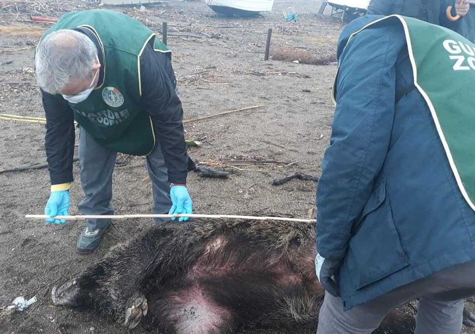 LA NOTA DELLE GUARDIE ZOOFILE CHE HANNO PROVVEDUTO AL RECUPERO – “Domenica mattina piovosa, cosa non ti aspetti? Non ti aspetti che il capo segreteria del sindaco Miska Morelli, ti chiami e ti dica che c’è un cinghiale deceduto sulla spiaggia di Porto Pidocchio e che il Sindaco Alessandro Grando è già sul posto. Immediatamente una squadra di Guardie Ecozoofile di FareAmbiente Ladispoli parte per raggiungere il luogo indicato. Giunti dopo pochi minuti sul posto, lo scenario apparso ai nostri occhi è questo: un grosso cinghiale, ormai morto, riverso sulla spiaggia. Nello stesso istante abbiamo attivato tutte le procedure necessarie all’esame ed alla rimozione della carcassa. Avvisiamo il Comandante della Polizia Locale Sergio Umberto Blasi, la Asl Veterinaria ed il Consigliere Carmelo Augello determinanti per la riuscita tempestiva delll’intervento! Il medico veterinario che ha esaminato l’animale ci riferisce che è un cinghiale di tipo “solengo”. I cinghiali, infatti, generalmente camminano in branco ma il maschio più debole viene scartato dal gruppo ed emarginato. Il perdente, costretto a vivere da solo, viene per questo motivo soprannominato “solengo”. Circa 150 kg di animale deceduto probabilmente da 12h. Sotto la pioggia incessante, al freddo e al vento ma ce l’abbiamo fatta: la carcassa del grosso animale è stata correttamente esaminata e poi smaltita”.