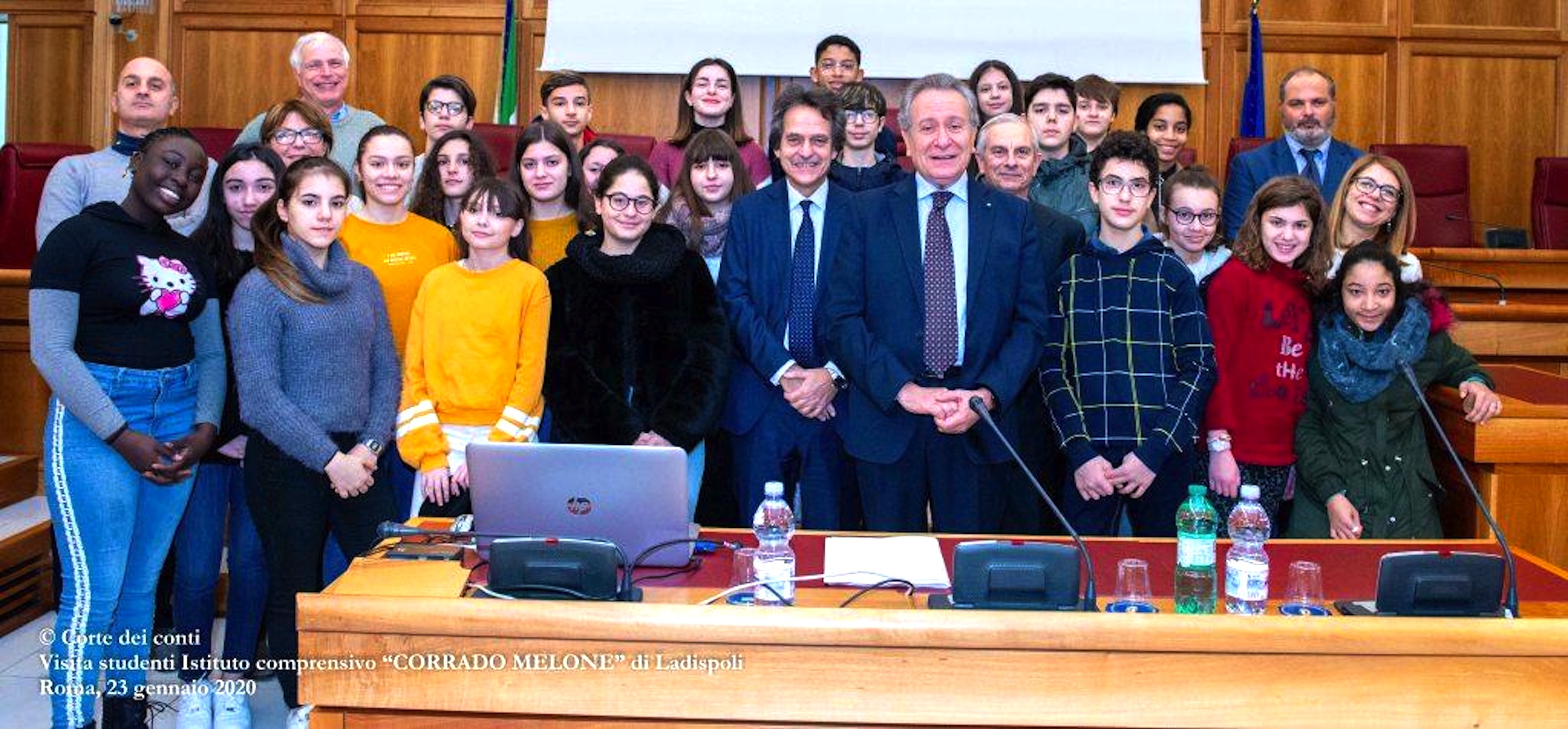 no al 2017. Una particolarità della Corte dei conti è che essa è l’unica istituzione in cui i busti dei presidenti vengono realizzati al momento del loro pensionamento e non della loro dipartita. Infatti gli ultimi tre busti che abbiamo ammirato si riferiscono a ex presidenti ancora in vita. Infine, abbiamo raggiunto la biblioteca dove siamo stati accolti dalla direttrice, la dottoressa Marina Silenzi, che ci ha spiegato con grande passione tutte le sezioni della biblioteca e anche il funzionamento del sito Internet. Ricchissima di opere, oltre 500 000 volumi, in materia giuridica, contabilità e storica. Purtroppo si stanno eseguendo dei lavori di ristrutturazione e non abbiamo potuto vedere la sala lettura. Qui abbiamo la raccolta completa degli atti parlamentari italiani dal 1861 a giorni nostri. Alcuni addetti si occupano dell’acquisizione di libri antichi: infatti abbiamo potuto ammirare da vicino opere di grande pregio che datavano a partire dal XVI secolo; con stupore abbiamo apprezzato tenendoli in mano volumi come “Le guerre de’ greci”, scritte da Senofonte edizione veneziana di Gabriel Giolito De’ Ferrari del 1572 o “Il giuramento di Ippocrate” oppure “Immagini de’ i dei degli antichi” in un’edizione veneziana di Giordano Ziletti del 1571, o “Descrittione di tutta Italia” edizione bolognese di Anselmo Giaccarelli, anche questa risalente al XVI secolo. Si concludeva così la nostra interessantissima visita alla Corte dei Conti. Tutti visibilmente entusiasmati dalla visita e dai complimenti ricevuti per l’educazione e la preparazione dimostrata, ci siamo avviati sulla strada del ritorno. È stata una visita molto interessante: ci ha reso consapevoli di quello che succede ai nostri soldi (o meglio a quelli dei nostri genitori) e quanto lavoro c’è dietro ad ogni piccola attività di controllo che a noi sembra banale. Noi pensiamo che niente abbia a che fare con lo Stato, ma invece noi incontriamo lo Stato svariate volte al giorno, da quando calpestiamo la strada, a quando andiamo a Scuola o dal medico, o usiamo un ponte o accendiamo un fornello … insomma qualsiasi cosa che facciamo si attua grazie allo Stato che ha dato il proprio supporto direttamente o indirettamente, ecco perché serve la Corte dei Conti, per controllare le spese e come vengono usati i soldi dei cittadini. Lo dobbiamo ammettere: prima di questa gita conoscevamo veramente poco quest’organo dello Stato e credevamo che fosse poco entusiasmante andarlo a visitare, invece, dopo la visita, ci siamo dovuti ricredere. Per dei ragazzi della nostra età è stata una lezione complessa e impegnativa ma allo stesso tempo istruttiva e divertente. La cosa che ci ha colpito di più è stato il processo: per la prima volta abbiamo assistito ad un processo dal vivo ed è stato molto emozionante. Senza dimenticare la bellezza degli ambienti: quadri, specchi, busti . . . tutto molto curato ed elegante alla pari di altri palazzi istituzionali che abbiamo visitato gli scorsi anni (dal Quirinale, a Palazzo Madama a Montecitorio eccetera). Grazie a questa visita alcuni di noi hanno maturato l’idea di intraprendere da adulti una carriera giuridica, chissà forse potrebbe essere la nostra vocazione. Comunque il 13 febbraio saremo tutti davanti alla TV per seguire l’inaugurazione dell’anno giudiziario per rivedere un luogo che abbiamo conosciuto. Ringraziamo tutto il personale per la gentile accoglienza, per averci fatto capire meglio il funzionamento del Paese in cui viviamo e dove cercheremo di costruire il nostro futuro. Un saluto dalle classi 3H e 3I dell’I.C Corrado Melone di Ladispoli (RM).