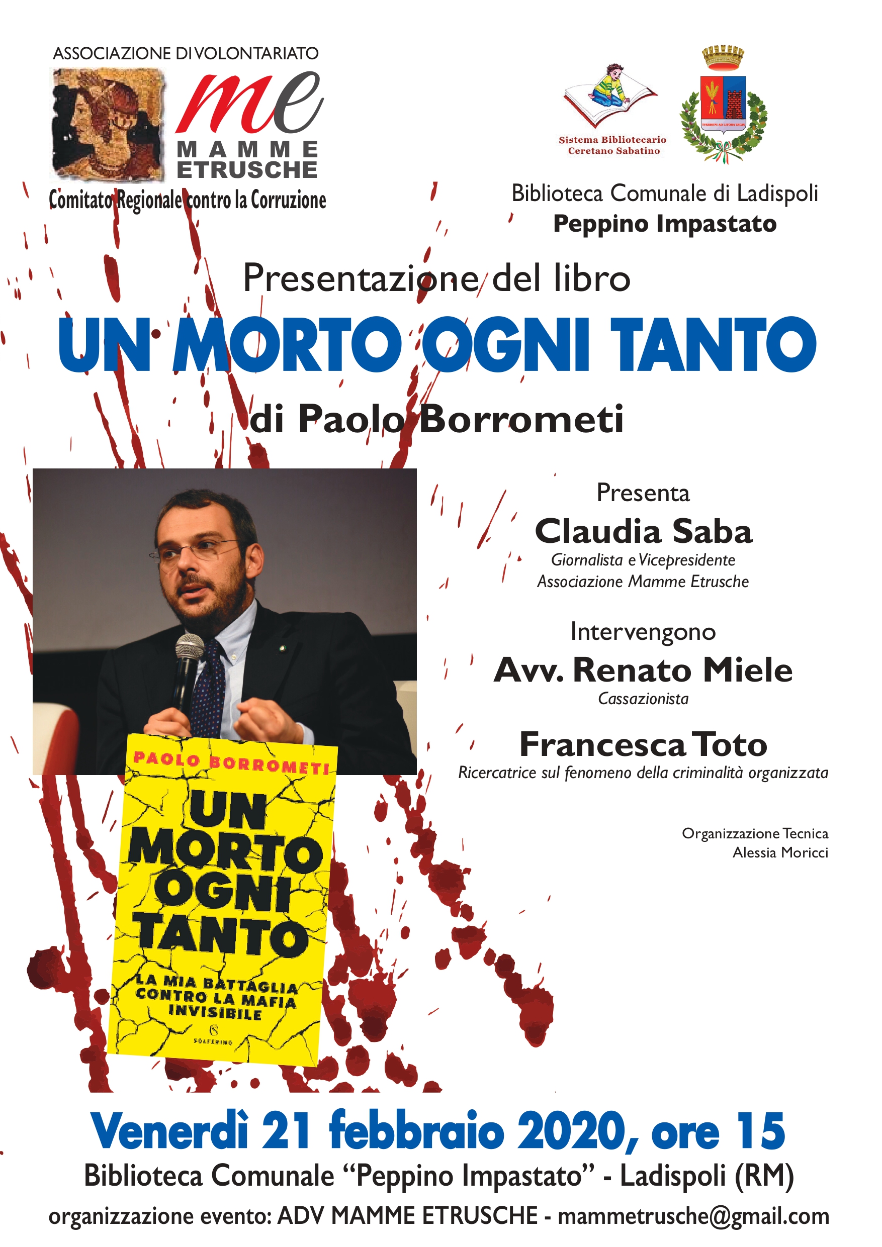 L’amministrazione di Ladispoli informa che, presso biblioteca comunale “Peppino Impastato”, venerdì 21 Febbraio, alle ore 15:00, si terrà la presentazione del libro “Un morto ogni tanto. La mia battaglia contro la mafia invisibile” di Paolo Borrometi. Paolo Borrometi è un giornalista d’inchiesta siciliano che scrive di mafia battendosi in prima linea, da anni costretto a una vita sotto scorta: alla prima aggressione, che lo ha lasciato menomato, sono seguite intimidazioni, minacce, il furto di documenti importantissimi per il suo lavoro, sino alla recente scoperta di un attentato che avrebbe dovuto far saltare in aria lui e la sua scorta.
