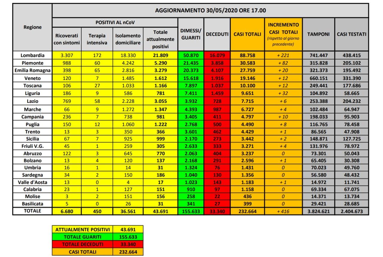 Altri 111 morti in Italia per coronavirus. Le vittime, dall’inizio dell’emergenza, sono 33.340 secondo quanto rende noto la Protezione Civile. I casi attualmente positivi sono 43.691, con un calo di 2.484 unità rispetto a ieri. In isolamento domiciliare 36.561 persone, mentre quelle ricoverate con sintomi sono 6.680. I pazienti in terapia intensiva sono 450, vale a dire 25 in meno rispetto a quelli registrati ieri. Calano i nuovi positivi ma aumentano i decessi in Lombardia: sono 221 i casi in più (con l’indice rapporto con i tamponi giornalieri che passa dal 2.5% al 1.6%) per un totale di 88.758 casi in regione. Ieri c’erano stati 352 nuovi positivi con circa lo stesso numero di tamponi, oltre 14mila. I nuovi decessi sono 68 per un totale di 16.079 morti in regione mentre ieri erano stati 38. Calano sia i ricoverati in terapia intensiva (-1, 172) così come quelli negli altri reparti (-245, 3.307) che ieri erano invece aumentati (+82). Sono i dati resi noti da Regione Lombardia.