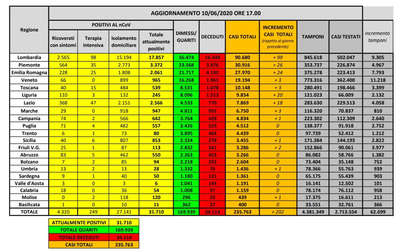 Coronavirus, il bilancio del 10 giugno: 71 morti (33.114), persone positive 31.710, pazienti dimessi 169.939