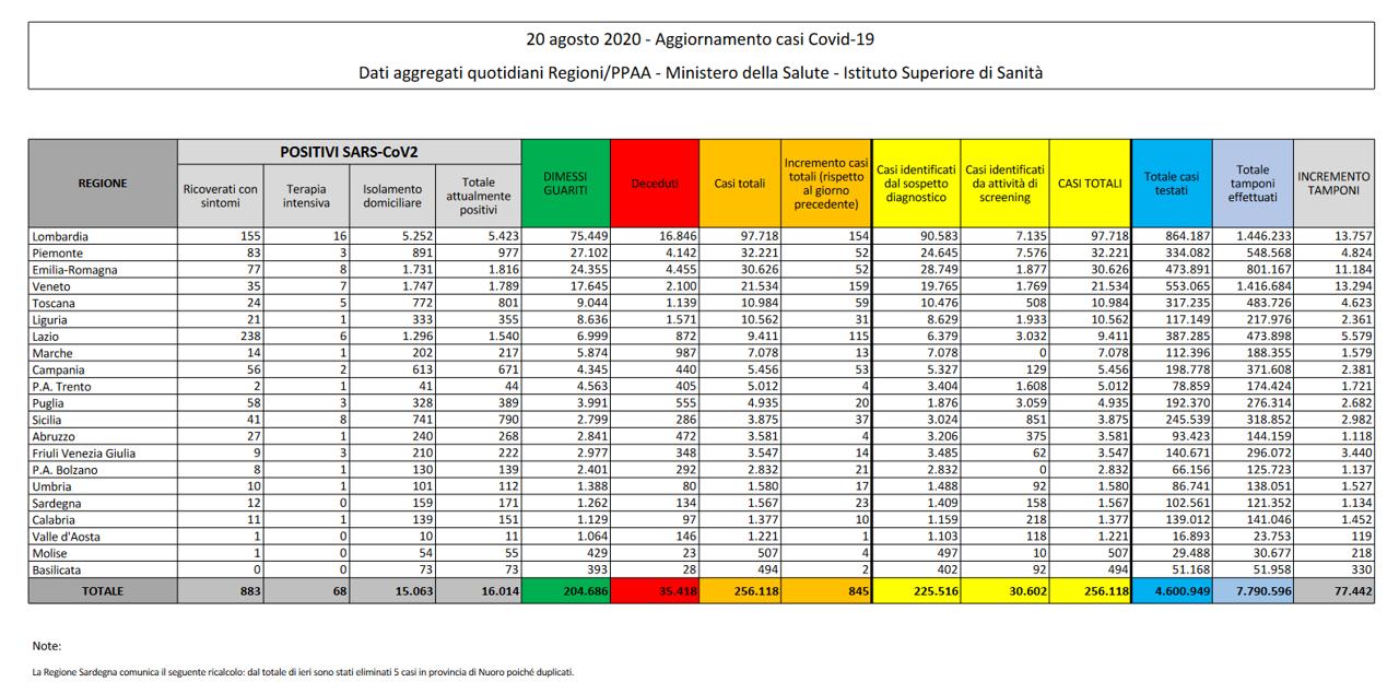 Continuano ad aumentare in Italia i contagi da coronavirus. Sono stati 845 nelle ultime 24 ore, mentre nel report precedente erano stati 642. Sei i morti da ieri che porta il totale a 35.418 da inizio emergenza. Sono i dati forniti dal ministero della Salute e pubblicati sul sito della Protezione Civile. Sono stati 180 i guariti nelle ultime 24 ore per un numero complessivo di 204.686 persone. I ricoverati in terapia intensiva sono 68 ricoverati, due in più di ieri. Anche oggi nessuna regione a contagi zero. Nelle ultime 24 ore sono stati effettuati 77.442 tamponi per un totale che sale a 7.790.596. Sono 154 i nuovi casi positivi al coronavirus in Lombardia (di cui 30 ‘debolmente positivi’ e 5 a seguito di test sierologico). E’ quanto emerge dai dati diffusi dalla Regione. Il totale dei guariti/dimessi sale invece a 75.449 (+51), di cui 1.285 dimessi e 74.164 guariti mentre i pazienti ricoverati in terapia intensiva sono 16 (+2) e quelli ricoverati non in terapia intensiva sono 155 (+4). Rispetto a 24 ore fa si registrano inoltre due decessi, facendo salire il totale complessivo dei morti dall’inizio dell’epidemia a 16.846. Quanto ai tamponi effettuati sono 13.757, per un totale di 1.446.233. Sono 47 i nuovi positivi nella provincia di Milano, di cui 26 a Milano città. Quanto alle altre province lombarde, aumentano i casi a Bergamo, dove si registrano 27 nuovi casi (ieri erano 13) e a Brescia (+23 contro i 18 di ieri). A Como i nuovi positivi sono 12, a Cremona 3, a Lecco 2, a Lodi 2, a Mantova 18, a Monza 7. Zero casi si registrano a Pavia, mentre a Sondrio sono 3 e a Varese 6.