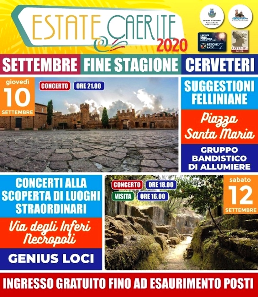 Si chiude l’Estate Caerite 2020 con gli ultimi due eventi musicali, che chiudono una rassegna all’insegna del rispetto delle normative anti-covid, non per questo priva di qualità e prestigio. Dopo le emozioni vissute con Daniele Silvestri, Ascanio Celestini, Max Giusti, Micol Arpa Rock, Antonello Costa e tanti altri artisti, arrivano a Cerveteri le Suggestioni Felliniane del Complesso Strumentale  Amici della Musica di Allumiere e i Concerti alla scoperta dei Luoghi Straordinari di Genius Loci. A presentare le serate è l’Assessora alle Politiche Culturali del Comune di Cerveteri Federica Battafarano, che dichiara: “Dopo il successo di questa atipica ma prestigiosa stagione estiva che ha visto tanti celebri artisti esibirsi in un Parco della Legnara dall’assetto completamente diverso, con ingressi contingentati e posti distanziati, chiudiamo ufficialmente l’Estate Caerite 2020 con questi due ultimi raffinati eventi. Il 10 Settembre alle ore 21.00 il Gruppo Bandistico di Allumiere “Amici della Musica” si esibirà in Piazza Santa Maria mentre il 12 Settembre  la Necropoli della Banditaccia ospiterà la musica di Genius Loci” Il primo concerto “Suggestioni Felliniane” celebra i 100 anni della nascita di Federico Fellini,  considerato uno dei maggiori registi della storia del cinema. Il maestro Rossano Cardinali dirigerà gli eccezionali musicisti del Complesso Bandistico di Allumiere in uno dei luoghi più rappresentativi della città, Piazza Santa Maria. L’ingresso allo spettacolo è gratuito fino ad esaurimento posti. Gli ingressi saranno contingentati, sarà misurata la temperatura corporea e ci sarà l’obbligo della mascherina fino al raggiungimento del proprio posto a sedere. Il secondo evento facente parte della rassegna “Concerti alla scoperta di Luoghi Straordinari” in collaborazione con MArteLive, si svolgerà all’interno di uno dei luoghi più suggestivi del territorio, la straordinaria Via degli Inferi nel sito UNESCO della Necropoli della Banditaccia. Anche l’ingresso a questo evento musicale, che partirà alle 18.00, sarà gratuito. Ci sarà l’obbligo della mascherina fino al raggiungimento del proprio posto, sarà misurata la temperatura corporea e non si potrà accedere qualora risultasse superiore ai 37,5°C. L’evento serale sarà solo l’epilogo di una giornata definita da Genius Loci “archeo-musicale. Dalle 16.00 di sabato 12 Settembre sarà infatti possibile partecipare alla visita guidata alla Necropoli durante la quale l’etruscologa Alessandra Petra darà vita ad una vera e propria lezione sulla vita quotidiana in epoca etrusca.