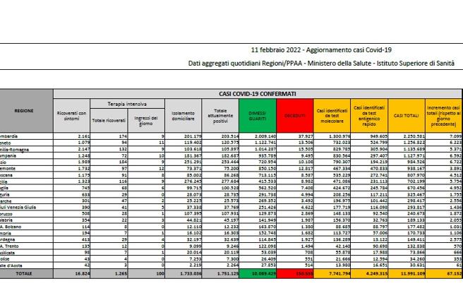 Sono 67.152 i nuovi contagi, secondo i dati e i numeri Covid – regione per regione – del bollettino della Protezione Civile e del ministero della Salute. Si registrano inoltre altri 334 morti. Nelle ultime 24 ore sono stati processati 663.786 tamponi con un tasso di positività al 10,1%. Sono 1.265 in terapia intensiva, -57 da ieri, mentre sono 16.824 ricoverati con sintomi, -530 da ieri.