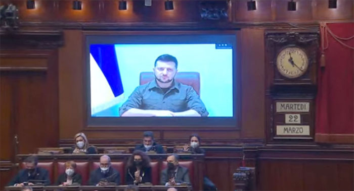Il premier ucraino Zelensky in diretta al Parlamento italiano: “Le immani distruzioni sono responsabilità di una sola persona”
