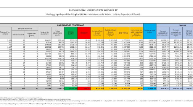 Sono 40.757 i nuovi contagi da Coronavirus in Italia oggi, domenica 1 maggio 2022, secondo i dati e i numeri Covid – regione per regione – del bollettino della Protezione Civile e del ministero della Salute. Si registrano, inoltre, altri 105 morti. Il numero delle vittime da inizio pandemia sale a 163.612 mentre complessivamente i casi totali sono 16.504.791. I tamponi in più effettuati da ieri sono 287.601 e il tasso di positività è al 14,2%. Sono 9.738 i ricoverati con sintomi Covid (-88 rispetto a ieri) e stabili i ricoveri in terapia intensiva (366) dove si sono registrati 30 ingressi del giorno. In totale gli attualmente positivi sono 1.231.670 e 1.221.566 le persone in isolamento domiciliare. In totale sono 15.109.509 i dimessi e guariti (+39.195).