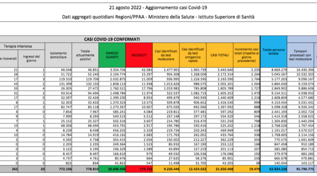 Sono 19.470 i nuovi contagi da Coronavirus in Italia oggi, 21 agosto 2022, secondo i dati e i numeri Covid – regione per regione – del bollettino della Protezione Civile e del ministero della Salute. Si registrano inoltre altri 63 morti. Nelle ultime 24 ore sono stati 118.520 i tamponi processati, tra molecolari e antigenici, che fanno rilevare un tasso di positività al 16,4% in leggero rialzo rispetto al 14,8% di ieri. In calo i ricoveri con sintomi, 86 in meno da ieri per un totale di 6.442, mentre sono in crescita le persone in terapia intensiva, 6 in più rispetto a ieri per un totale di 262.
