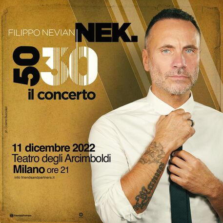 Era il 1992 quando il ventenne Nek pubblicava il suo omonimo album di debutto. Adesso, nel 2022, Filippo Neviani è pronto a festeggiare i suoi 50 anni d’età e i 30 anni di carriera artistica dal vivo, l’11 dicembre al Teatro degli Arcimboldi di Milano, e con un progetto discografico di prossima uscita. “50|30”, questo il nome dell’evento, sarà l’unica tappa del 2022 del trentennale di carriera di Nek, un’occasione per poter rivivere e cantare dal vivo tutti i grandi successi e le intramontabili hit dell’artista come “Laura non c’è”, “Lascia che io sia”, “Se io non avessi te” e “Fatti avanti amore”. Nek porterà live la sua energia e la sua grinta, ripercorrendo la sua incredibile carriera nella dimensione che da sempre riesce a far emergere al meglio la sua essenza come artista: il palco. Cantante e polistrumentista, con alle spalle oltre 10 milioni di dischi venduti in tutto il mondo e 18 album in studio, Nek è una delle voci maschili più interessanti e amate del panorama musicale italiano. Dopo l’esordio nel 1992 con l’album “Nek”, tantissimi i successi che si sono susseguiti nei suoi 30 anni di carriera, da “Laura non c’è” a “Se io non avessi te”, da “Almeno stavolta” a “Lascia che io sia”, o ancora “Fatti avanti amore” e “Se una regola c’è”, senza dimenticare la cover di “Se telefonando”, eseguita sul palco del Festival di Sanremo nel 2015. Negli ultimi anni è stato impegnato nella conduzione di fortunati programmi televisivi, ultimo dei quali “Dalla Strada Al Palco”, in prima serata su Rai 2, che ha raccolto straordinari consensi di pubblico e critica.