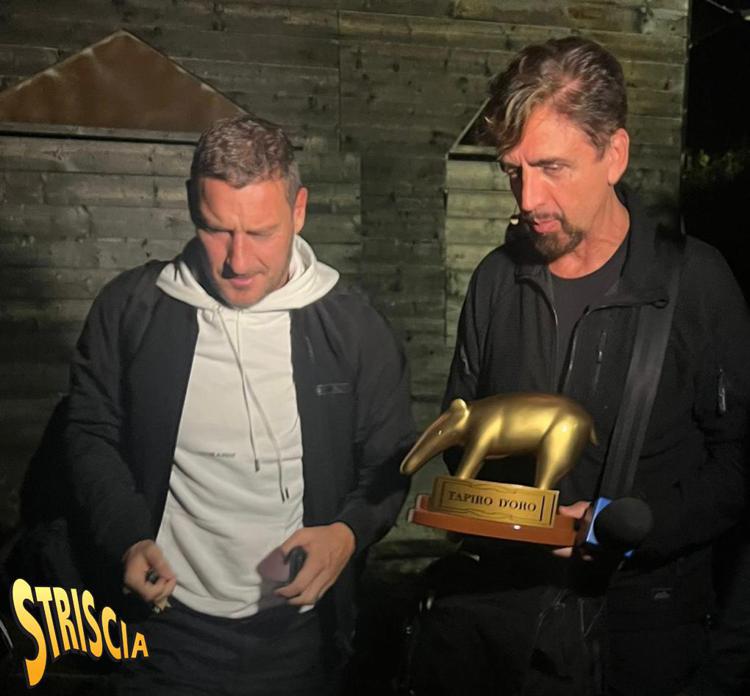 Roma, Tapiro d’oro per Francesco Totti. L’inviato di Striscia: “Non dirlo a Ilary, altrimenti ti fa sparire anche questo…”