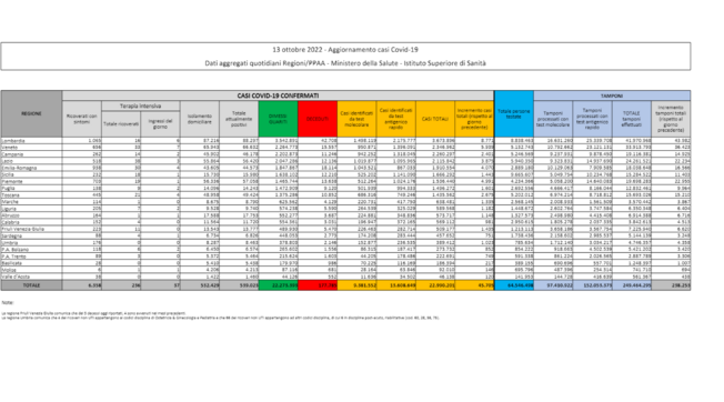 L’Italia registra 45.705 nuovi casi di Covid a fronte di 238.253 tamponi (il giorno precedente erano stati 47.763 su 244.746 test) nelle ultime 24 ore. Lo riporta il ministero della Salute, secondo cui i morti sono 66 (mercoledì erano stati 69). I dimessi e i guariti sono 40.067. Aumentano gli ingressi in terapia intensiva (+8) mentre diminuiscono i ricoveri nei reparti ordinari (-126). In calo il tasso di positività al 19,2% (-0,3%). l totale dei casi di Covid rilevati dall’inizio della pandemia in Italia è di 22.990.201. Sono 236 i pazienti ricoverati in terapia intensiva nel bilancio tra entrate e uscite (ieri erano 228), cioè 8 in più, mentre gli ingressi giornalieri sono 37. I ricoverati nei reparti ordinari sono 6.358 (ieri erano 6.484), cioè 126 in meno. Gli attualmente positivi sono 539.023, mentre il totale dei decessi dall’inizio della pandemia è 177.785.