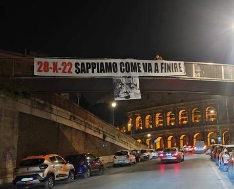 Uno striscione con su scritto “100 anni dopo la marcia continua” e accompagnato dalla gigantografia di Benito Mussolini e’ stato esposto nella tarda serata di oggi al Colosseo, al centro di Roma. Sul posto le forze dell’ordine per rimuovere l’immagine. Un altro striscione con su scritto “28-X-2022 sappiamo come va a finire” è stato esposto dagli antifascisti a pochi passi dal Colosseo, al centro di Roma. Accanto allo striscione una foto di Benito Mussolini capovolta, a ricordare i fatti di piazzale Loreto. Poco dopo l’immagine è stata raddrizzata e accompagnata da un altro striscione, a coprire il precedente, con la scritta “100 anni dopo, la marcia continua”. Accanto a quest’ultima versione e’ apparso il logo del Movimento Nazionale, un gruppo di estrema destra.