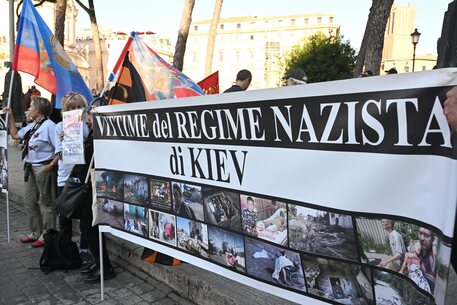 Striscioni filorussi e anti Ucraina e bandiere del Donbass al presidio antifascista organizzato nella Capitale contro la marcia su Roma di cui in questi giorni ricorre il centenario. I manifestanti, alcune decine di persone, si sono ritrovati in piazza Madonna di Loreto, a due passi da piazza Venezia. “Odessa 2 maggio 2014. I nazisti con la bandiera dell’Ucraina in mano, cantando l’inno ucraino, massacravano gli abitanti di Odessa”, è scritto in uno striscione del collettivo ‘La comune di Ravenna’. “La Russia la liberatrice dell’Ucraina dal terrore ucro-nazista da 8 anni!” è scritto su un altro stendardo. Al presidio sono presenti, tra gli altri, i compagni di Walter Rossi, associazione Cortocircuito, Città Futura, Rivista Internazionale Companis, Interstampa e Radio Onda Rossa, Comitato di solidarietà della Bielorussa.