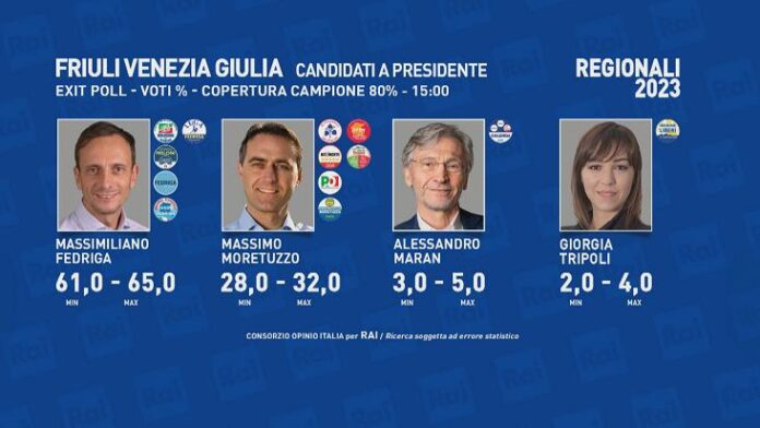 Pochi istanti dopo le chiusura dei seggi, alle 15, arriva il primo exit poll In testa c’è il candidato uscente del centrodestra Massimiliano Fedriga con preferenze comprese in una forbice tra il 61 e il 65%. Segue il candidato del centrosinistra Massimo Moretuzzo tra il 28 e il 32%. Terzo al momento il candidato del Terzo Polo Alessandro Maran tra il 3 e il 5% Quarta la candidata di Insieme Liberi Giorgia Tripoli tra il 2 e il 4% delle preferenze di voto. Gli elettori chiamati alle urne in sono stati oltre 1,1 milioni, suddivisi in 215 comuni e 1.360 sezioni. In particolare, in 24 comuni, tra cui Udine, si vota anche per il rinnovo di sindaco e Consiglio comunale. Lo scrutinio delle amministrative comincerà al termine dello spoglio delle schede regionali. E’ stato un po’ il nemico comune da combattere durante la campagna elettorale, ma, nonostante gli sforzi e gli appelli reiterati per recarsi alle urne, anche il Friuli Venezia Giulia, come di recente accaduto a Lazio e Lombardia, soffre la disaffezione al voto. Alle 19, l’affluenza alle Regionali si attesta al 29,31% (325.137 persone su 1.109.395 aventi diritto). In calo rispetto alla partecipazione riscontrata nel 2018 in occasione della precedente tornata. Allora alle 19 il dato definitivo sull’affluenza si era attestato sul 38,37%, ma si votava in un’unica giornata. Questa volta invece si potrà continuare ad andare al seggio fino alle 15 di domani. Poi comincerà lo spoglio delle schede. Si parte dallo scrutinio delle regionali, a seguire quello delle amministrative, che coinvolgono 24 comuni, tra cui Udine. Il verdetto sul Fvg potrebbe arrivare già nel tardo pomeriggio. E guarderà oltre i confini dell’ultima regione a Nordest, perché l’esito sarà l’occasione di un ennesimo test per il governo, dopo le regionali di febbraio. Ma sarà anche il debutto alle urne per il Pd targato Elly Schlein.