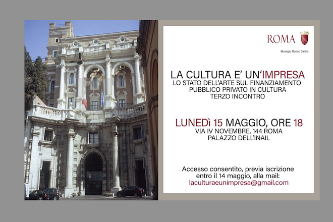 Torna lunedì 15 maggio “La Cultura è un’Impresa”, l’ormai tradizionale tavola rotonda sul tema del finanziamento pubblico-privato nei confronti della cultura e dell’arte voluta dal Municipio Roma I Centro. L’incontro, il terzo della serie, si terrà alle ore 18 presso il palazzo dell’Inail di via IV Novembre 144. Per partecipare è necessario iscriversi entro il 14 maggio alla mail: laculturaeunimpresa@gmail.com. L’evento è organizzato dall’assessora municipale alla Cultura, Giulia Silvia Ghia. “Siamo arrivati al terzo incontro- ha spiegato proprio Ghia– la rete a supporto dei progetti del Municipio Roma I Centro e delle imprese culturali e creative del territorio si allarga. L’obiettivo è far diventare la co-progettazione e il partenariato pubblico-privato oltre che una ‘policy’ anche un vero e proprio modello di rigenerazione partecipata della città”.