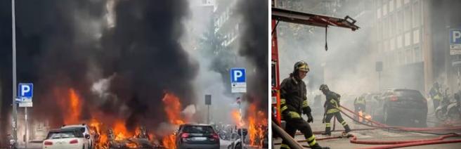 Impressionante incendio a Milano in zona Porta Romana, all’angolo tra via Pier Lombardo e via Vasari, causato dall’esplosione di un camion che trasportava bombole di ossigeno. L’autista, un 53enne, è rimasto ferito a una mano e a una gamba. È stato trasportato in codice giallo all’ospedale. Il rogo ha coinvolto almeno cinque auto parcheggiate in strada, una farmacia attigua e un edificio vicino che è stato evacuato: due gli appartamenti interessati, al primo e al secondo piano. Per precauzione sono stati evacuati anche l’Istituto Auxologico Pier Lombardo e la scuola materna Vasari. Le fiamme sono state domate dai vigili del fuoco. Sul posto anche la polizia locale e un’ambulanza. I carabinieri hanno transennato la zona. “Ho sentito l’esplosione – ha detto un giovane arrivato sul posto – abito qui, ho perso la moto e la macchina che sono andate a fuoco, sono entrato nell’edificio per recuperare i miei gatti ma c’era troppo fumo”. “Per fortuna si sono escluse cause dolose e attentati”, ha spiegato il sindaco di Milano Giuseppe Sala, giunto sul posto dell’incendio. L’autista, che è ustionato e non è in una situazione di pericolo di vita, ha detto ai vigili del fuoco di aver visto accendersi un incendio dal vano motore che poi ha preso rapidamente le bombole di ossigeno che stava trasportando qua vicino”, ha proseguito il primo cittadino. “Ha cercato di limitare i danni ma poi c’è stata l’esplosione. Abbiamo sgomberato l’istituto comprensivo che c’è dall’altro lato della strada. La dinamica sembra, nella sua gravità, abbastanza semplice. La situazione sembra sotto controllo”.