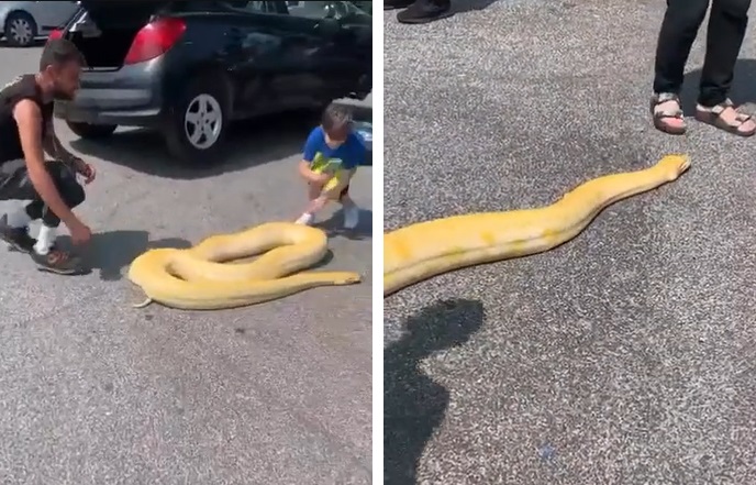Stanno facendo il giro del web le immagini di un grande serpente avvistato a Roma, nel quartiere San Basilio. L’animale, un pitone albino, è stato filmato all’altezza di via Fabriano ed ha attirato l’attenzione dei passanti, che si sono avvicinati per guardarlo da vicino e ‘accarezzarlo’. Tra loro anche un bambino. Non è chiaro come il grosso rettile sia finito in strada. L’ipotesi più probabile è che fosse l’animale domestico di qualche residente, che ha poi deciso di ‘liberarsene’ viste le grandi dimensioni.