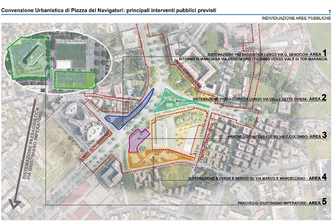 Avviati i cantieri delle opere destinate a cambiare totalmente il volto di Tor Marancia – Piazza dei Navigatori – Via Giustiniano Imperatore. Gli interventi previsti nella Convenzione Urbanistica di Piazza dei Navigatori destinati, nei prossimi anni, a trasformare la zona sono stati presentati dall’Assessore all’Urbanistica di Roma Capitale, Maurizio Veloccia, dal Presidente del Municipio Roma VIII, Amedeo Ciaccheri e dall’Architetto Mario Cucinella. La convenzione prevede la realizzazione di parcheggi pubblici per ca. 39.000 mq, verde pubblico per ca. 16.000 mq, oltre al ridisegno dei percorsi delle piste ciclabili, alla realizzazione di servizi per il quartiere come la nuova “Bocciofila”, uno skate park e una area giochi per i bambini più piccoli. È previsto, inoltre, un generale riordino dell’assetto urbano attraverso la sistemazione paesaggistica sia dei margini di Via Cristoforo Colombo ricadenti nel perimetro di convenzione, sia di tutte le aree che mediano il nucleo dell’intervento con tutto il quartiere, estendendosi sino al Piano di Assetto di Viale Giustiniano Imperatore. L’intero quadrante sarà poi totalmente riqualificato nella sua funzione di verde pubblico, di standard urbanistici e servizi per territorio, aumentando la presenza di esemplari arborei in un’ottica di “forestazione urbana”. Il sistema infrastrutturale locale beneficerà di significative semplificazioni viabilistiche, tra cui il ritorno di marcia da Via Cristoforo Colombo verso Viale di Tor Marancia, consentendo la completa sincronizzazione semaforica lungo Via Cristoforo Colombo. Si partirà il 15 luglio con la demolizione dell’ex Bocciofilo di via delle Sette Chiese. “Con il presidente dell’VIII Municipio Ciaccheri abbiamo lavorato da inizio mandato per riavviare queste opere e, soprattutto – spiega l’Assessore all’Urbanistica di Roma Capitale Maurizio Veloccia – per costruire un piano ordinato e integrato di tutti gli interventi urbanistici del quadrante. Oltre ai lavori relativi a piazza dei Navigatori, abbiamo annunciato anche l’avvio della realizzazione di un nuovo stralcio del Parco di Tor Marancia, altri 6.5 ettari che sia aggiungono ai 13,5 aperti a settembre. Stiamo correndo per riaprire questo polmone verde, importante per tutta la città. Allo stesso modo ora siamo concentrati sul recupero della ex Fiera con la sottoscrizione del Protocollo di intesa che detta tempi e definisce le linee guida per il Concorso internazionale con cui otterremo il Masterplan dell’intervento”.