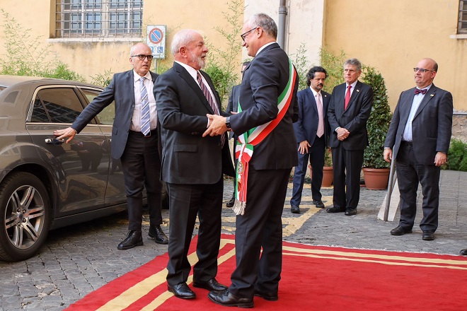 Visita ufficiale in Campidoglio del Presidente della Repubblica Federativa del Brasile Luiz Inàcio Lula da Silva, che oggi a Roma ha incontrato anche il Pontefice, il Presidente della Repubblica Mattarella e il Presidente del Consiglio Giorgia Meloni.  L’arrivo al Colle capitolino è stato salutato dallo squillo di tromba dei Fedeli di Vitorchiano. Accolto con un abbraccio dal Sindaco Roberto Gualtieri, è accompagnato dalla moglie Janja Lula da Silva, dal Ministro degli Esteri Mauro Luiz Iecker Vieira, dal Consigliere Speciale del Presidente Celso Luiz Nunes Amorim e dalla delegazione ufficiale brasiliana.