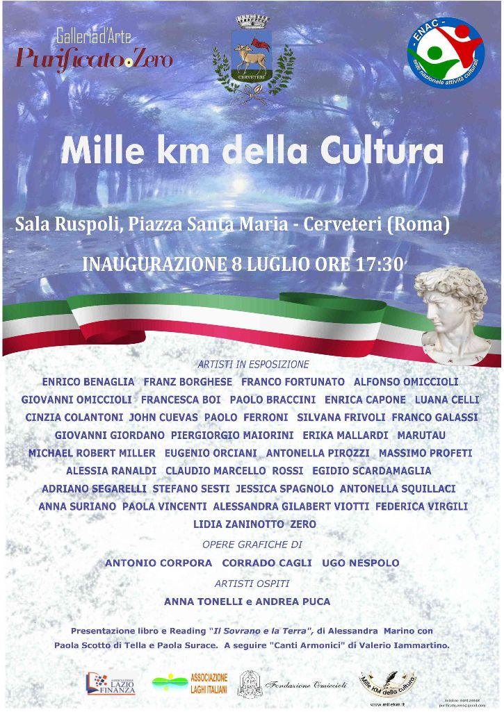Dopo il successo della prima edizione, ritorna la manifestazione dal titolo “Mille km della Cultura, “ promossa ed organizzata dalla Galleria Purificato.Zero e ENAC. Quest’anno sono le città etrusche protagoniste, con la partenza dal sito Unesco di Cerveteri. La mostra itinerante si svolgerà nel periodo compreso tra Luglio e Dicembre 2023, con un itinerario che toccherà poi Farnese, Pistoia, Forlì per terminare a dicembre a Roma. Un viaggio di circa 5 mesi all’insegna delle arti visive, con lo scopo di promuovere la diffusione della cultura. Lo spirito dell’iniziativa prevede di effettuare un’esplorazione nella storia dell’arte moderna e contemporanea da eseguire per grandi temi in modo da catturare l’attenzione e la curiosità del visitatore attraverso un ciclo di mostre itineranti che, organizzate in dimore storiche e antichi palazzi d’Italia, rilancerà il forte richiamo alla conoscenza, all’identità nazionale e allo spirito di collaborazione. Arricchire gli animi con sensazioni fatte di tempo, spazio ed emozioni vissute, con alcune giornate dedicate anche alle scuole nei territori ospitanti la manifestazione, per stimolare il pubblico a confrontarsi con gli argomenti proposti dai differenti linguaggi espressivi in una simbiotica armonia tra moderno e contemporaneo. Sarà questa la chiave per accendere la curiosità del visitatore che potrà osservare opere di artisti già affermati nel panorama nazionale ed internazionale, accanto a giovani talentuosi ed emergenti di alto profilo. Una diversa consapevolezza del proprio ambiente, ed un maggiore interesse verso i beni culturali e il patrimonio artistico, verrà raggiunta recuperando un modo più duttile di presenza attiva nel contesto cittadino dell’individuo che si riappropria di una realtà che l’arte gli offre nella cultura con la sua autenticità e adattabilità ai tempi, grazie alla costante presenza di curatori e critici a trasportare i visitatori nelle visioni d’arte.