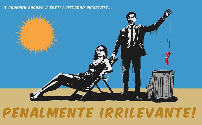 Nella notte tra l’11 e il 12 luglio la street artist Laika lascia ancora una volta il segno sui muri di Roma. Il poster dal titolo ‘Estate Italiana’, affisso in via di villa Ada davanti al Ministero del Turismo, ritrae la Ministra del Turismo Daniela Santanchè e il Presidente del Senato Ignazio La Russa (già protagonista dell’opera di Laika realizzata in occasione del 25 aprile), che augurano ai cittadini italiani un’estate “penalmente irrilevante”. La street artist cita la frase pronunciata dal presidente La Russa in merito alle accuse di violenza sessuale rivolte al figlio, con la quale il senatore ha pubblicamente colpevolizzato e sminuito la ragazza presunta vittima. Accanto al Presidente del Senato troviamo la ministra Santanchè, finita nell’occhio del ciclone per l’inchiesta giudiziaria sulle sue imprese, ammanettata ad una sdraio presumibilmente del Twiga. “Ciò che sta accadendo in questi giorni è incredibile, la seconda carica più importante dello stato si permette di sminuire a parole una presunta violenza sessuale, quasi colpevolizzando la giovane vittima. Non ci si poteva aspettare altro da una figura come La Russa, massima rappresentazione del patriarcato e, non dimentichiamocelo, fervente ‘nostalgico’. In un paese in cui avviene un femminicidio ogni tre giorni, tali affermazioni non sono tollerabili”, dichiara Laika. Riguardo alla Santanchè, invece, l’artista prosegue: “La nostra ministra del Turismo ha un evidente conflitto di interessi in stile berlusconiano e gestisce irresponsabilmente le sue società a danno dei suoi dipendenti, pagati addirittura a rimborso spese. Chi si arricchisce sfruttando i lavoratori merita di pagare, non solo di dimettersi. Le questioni a mio avviso sono tutt’altro che ‘penalmente irrilevanti’.
