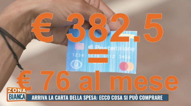 È disponibile dal 18 luglio “Dedicata a te”, la social card destinata a più di un milione di famiglie italiane. La tessera elettronica, distribuita da Poste Italiane, permetterà di acquistare generi alimentari di prima necessità con un contributo unico di 382,50 euro, circa 76 euro al mese. “Zona Bianca” con l’aiuto di una famiglia di Chiusi (SI) spiega come sarà possibile utilizzare la tessera negli esercizi commerciali che aderiscono all’iniziativa. L’iniziativa coinvolgerà circa un milione e 300mila famiglie “che hanno maggiori difficoltà nell’acquisto dei generi alimentari di prima necessità”, ha dichiarato la presidente del Consiglio Giorgia Meloni aggiungendo che per il sussidio sono stati stanziati circa 500 milioni di euro. La tessera non è prevista per tutti gli individui in difficoltà, ma è destinata solo alle famiglie di almeno tre componenti e con un Isee fino a un massimo di 15.000 euro e che non godono di altre integrazioni da parte dello Stato. Sono pertanto esclusi i titolari di Reddito di cittadinanza, del Reddito di inclusione o qualsiasi altra misura di inclusione sociale o sostegno alla povertà. Tutti i cittadini che percepiscono l’Indennità mensile di Disoccupazione per i collaboratori (Dis-Coll), l’Indennità di mobilità, Fondi di solidarietà per l’integrazione del reddito, Cassa Integrazione (Cig) o qualsiasi differente forma di integrazione salariale o di sostegno nel caso di disoccupazione involontaria, erogata dallo Stato. L’iniziativa, volta a contrastare il “caro-carrello”, permetterà alle famiglie destinatarie della misura di acquistare generi alimentari. Non tutti, però, sono considerati di prima necessità. Sì a carne, pesce, frutta e verdura. Ma restano esclusi tutti i prodotti surgelati. Anche la marmellata, per esempio, non è considerata un genere alimentare di prima necessità, al suo posto però sarà possibile scegliere di acquistare del miele naturale. Stesso discorso per l’aceto balsamico, escluso dalla lista della spesa, ma che potrà essere sostituito dall’aceto di vino.