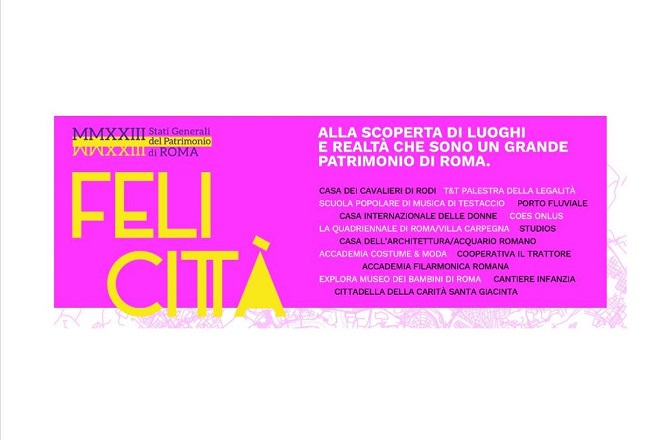 Dopo il successo degli Stati Generali del Patrimonio dello scorso anno, Roma rilancia con un nuovo evento diffuso: giovedì 20 luglio, dalle 18 alle 24, in 15 diversi spazi e in 8 Municipi differenti, si svolgerà “Felicittà“, una serata dedicata alle tante realtà che abitano il Patrimonio di Roma e che questa Amministrazione vuole ringraziare. A questa edizione parteciperanno: Casa dei Cavalieri di Rodi, T&T Palestra della Legalità, Scuola Popolare di Musica di Testaccio, Porto Fluviale, Casa Internazionale delle Donne, Coes ONLUS, La Quadriennale di Roma – Villa Carpegna, Studios, Casa dell’Architettura – Acquario Romano, Accademia Costume & Moda, Cooperativa Il Trattore, Explora – Museo dei Bambini di Roma, Cantiere Infanzia, Cittadella della Carità Santa Giacinta (Caritas), Accademia Filarmonica Romana. Ciascuna di queste realtà avrà l’occasione di raccontarsi, far visitare gli spazi, parlare dei loro progetti alle romane e ai romani. Ci saranno concerti gratuiti, mostre, lezioni aperte, giochi, dibattiti, proiezioni e molto altro. Una serata dedicata al Patrimonio e a chi gli dà vita ogni giorno.