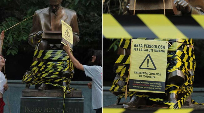 A Milano la statua di Indro Montanelli, situata nei giardini pubblici di Porta Venezia, è stata ricoperta di nastro giallo e nero dagli attivisti di Extinction Rebellion. “L’area del parco, così come l’intera Pianura Padana, viene definita ‘Pericolosa per la Salute Umana’ dalla comunità scientifica, soprattutto per i più piccoli e gli anziani”, denunciano gli attivisti. Sul basamento e lungo il muretto che fa da cornice alla statua sono stati incollati dei poster gialli con la scritta “Area pericolosa per la salute umana – Crisi climatica ed ecologica” e un triangolo di pericolo con l’avvertimento: “Nell’aria che stai respirando sono stati rilevati inquinanti oltre la soglia di sicurezza per la salute umana”. Il messaggio è accompagnato da una serie di dati relativi alla bassa qualità dell’aria della Pianura Padana e alle morti premature di bambini e anziani che provoca. Con gli stessi poster, già giovedì il movimento aveva denunciato la grave situazione alla cittadinanza, rendendo inaccessibili tramite il nastro segnaletico le strutture ludiche per i bambini in più parchi giochi di Milano. La statua dedicata al giornalista è da tempo oggetto di proteste e tre anni fa è stata imbrattata di vernice. “Indro Montanelli – scrivono i militanti di Extinction Rebellion – è il simbolo di un passato, ma anche di un presente, costruito sul mito della crescita infinita, dello sfruttamento di territori, persone e risorse. Per questo abbiamo scelto questo monumento, per denunciare la miopia del governo italiano e regionale rispetto alla crisi ecoclimatica e all’inquinamento atmosferico”.