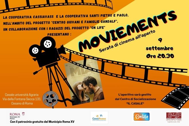 Il 9 settembre alle 20.30 presso il Casale dell’Università Agraria di Cesano, in via della Fontana Secca 131, si svolge la seconda edizione di “Moviements”, una serata di cinema all’aperto con ingresso gratuito. L’evento, patrocinato dal Municipio Roma XV, è organizzato dalle Cooperative Cassiavass e Santi Pietro e Paolo, enti gestori del progetto Municipale “Centro Giovani e Famiglie Gandalf” finanziato con i fondi della legge 285/1997. La serata sarà gestita dai ragazzi del progetto “On Life”. Nel corso della serata sarà possibile consumare un aperitivo organizzato dal centro di Socializzazione per ragazzi con disabilità Lieve – media “Il Casale”.