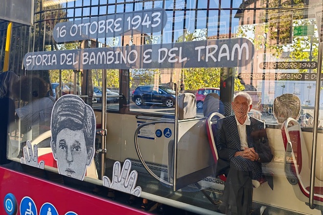 Piazza di Monte Savello ha fatto da scenografia alla presentazione del progetto “16 ottobre 1943. Storia del bambino e del tram”, inserito nel palinsesto di eventi che Roma Capitale ha organizzato in occasione dell’80° Anniversario del rastrellamento degli ebrei. Ideato e organizzato dal Centro di Cultura Ebraica e promosso dalla Fondazione Museo della Shoah, dalla Comunità Ebraica di Roma e in collaborazione con ATAC, il progetto ha lo scopo di restituire alla cittadinanza una storia di dolore ma anche di umanità e solidarietà. Dieci bus della linea 23, in circolazione fino al 31 ottobre, sono allestiti con vetrofanie, pendolini e sottotetti che raccontano la storia di Emanuele Di Porto attraverso la realizzazione di una grafica e di un QR code che permette al pubblico di approfondire la storia del bambino del tram attraverso un filmato animato ed altri contributi, mentre la grafica con un immediato impatto visivo sollecita l’interesse dei passanti. L’auspicio è che la storia del 16 ottobre 1943, e quella di Emanuele in particolare, “viaggiando” per la città possa raggiungere e sensibilizzare il pubblico ampio ed eterogeneo degli utenti del trasporto urbano. Emanuele Di Porto (Roma, 1931) riesce fortunosamente a sfuggire alla retata nazista scendendo dalla camionetta su cui era stato caricato con la madre, che prontamente lo spinge via. Il bambino, rimasto solo, giunge a piazza Monte Savello, dove all’epoca stazionava una linea di tram, e sale sul primo mezzo che trova. Confida quanto appena accaduto al bigliettaio che lo invita a rimanere accanto a lui con la complicità del conducente. Emanuele rimarrà nascosto sul tram per due giorni, protetto dai tranvieri che si succedono a bordo, fino a quando un conoscente lo incontra e gli permette di ritrovare il padre, anche egli scampato alla deportazione.