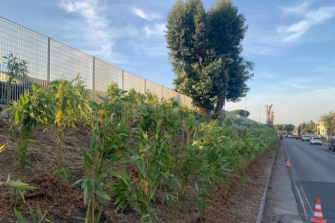 Visita all’impianto AMA di Rocca Cencia dell’Assessora all’Agricoltura, Ambiente e Ciclo di Rifiuti, Sabrina Alfonsi, insieme alla Presidente dell’Assemblea Capitolina Svetlana Celli, al Direttore Generale di AMA, Alessandro Filippi ed alcuni rappresentanti del Coordinamento dei Comitati e delle Associazioni Unite Roma Est (CAU). Si è trattato di un sopralluogo di verifica del buon esito degli interventi – terminati nella giornata di ieri – per la messa a dimora di 340 piante di bambù gigante lungo il franco laterale di via di Rocca Cencia che costeggia l’omonimo impianto di trattamento rifiuti di AMA. Realizzato un impianto di irrigazione per favorire l’attecchimento e la crescita delle piante, che possono raggiungere in poco tempo diversi metri in altezza ed espandersi fino a contare fino a 25 fusti per ogni pianta, garantendo la formazione di una barriera vegetale molto fitta. Inoltre, il bambù emette il 40% in più di ossigeno e assorbe il 35% in più di CO2 rispetto a un albero equivalente. “Si tratta di una sperimentazione che abbiamo avviato per realizzare una schermatura naturale all’impianto, che continua a svolgere alcune importanti funzioni anche dopo la chiusura, ad aprile di quest’anno, dell’impianto di trattamento meccanico biologico (TMB)” ha commentato l’Assessora Sabrina Alfonsi. “Abbiamo deciso di utilizzare il bambù gigante per le sue caratteristiche peculiari, che lo rendono particolarmente adatto a svolgere questo genere di funzione: crescita rapida, elevatissima capacità di captazione della CO2 e di filtraggio delle polveri inquinanti, efficacia nell’attenuazione dei rumori e degli odori provenienti dall’attività dell’impianto. Oggi abbiamo voluto condividere con i cittadini del territorio una ulteriore tappa di un percorso che progressivamente ci porterà, nei mesi e negli anni prossimi, ad alleggerire il carico ambientale di questo impianto anche grazie alla sua trasformazione in impianto di trattamento delle frazioni secche recuperate dalla raccolta differenziata”, conclude Alfonsi. “Prosegue il nostro impegno per dare nuova vita all’ex Tmb di Rocca Cencia dopo la sua chiusura e per risanare una ferita ambientale nel territorio del Municipio VI. Va in tale direzione il progetto sperimentale che prevede la piantumazione di alberi di bambù nell’area circostante l’impianto. Oltre ad assorbire anidride carbonica, svolgeranno anche una funzione fonoassorbente. E, più in generale, è un ulteriore passo in avanti nel percorso di bonifica del terreno e di contrasto all’inquinamento. Diamo così una risposta ai cittadini e ai comitati di questa zona della città che erano presenti anche questa mattina. Un ringraziamento ad Ama e all’Assessora Sabrina Alfonsi per questo risultato”, afferma la Presidente Svetlana Celli. Per l’esecuzione dell’intervento é stato contattato il Consorzio Bambù Italia, al quale è stato affidato l’incarico di mettere a dimora le piante di bambù nella stagione di piantagione (autunno 2023). Le piante vengono da una azienda agricola di Faenza che si occupa della produzione di piante madri di bambù e vanta l’appoggio di team di esperti agronomi per lo studio, la progettazione e la successiva assistenza agli impianti di bambù.