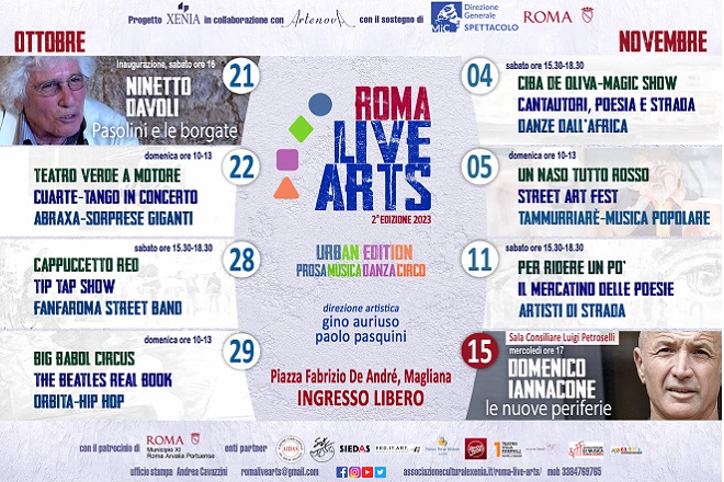 Da sabato 21 ottobre a sabato 11 novembre Progetto Xenia in collaborazione con Artenova propone una ricca locandina di eventi per tutti, nell’ambito della seconda edizione di “Roma Live Arts – Urban Edition“, a Piazza Fabrizio De André: musica, danza, poesia, prosa, circo, street art e artisti di strada animeranno la piazza nei fine settimana. Si conclude con un dibattito su “Le nuove periferie” nella Sala Consiliare “Luigi Petroselli” il 15 novembre alle 17. Sabato 21 ottobre alle 16 si parla di “Pasolini e le borgate” con la partecipazione di Ninetto Davoli. La manifestazione ha ottenuto il patrocinio del Municipio Roma XI.