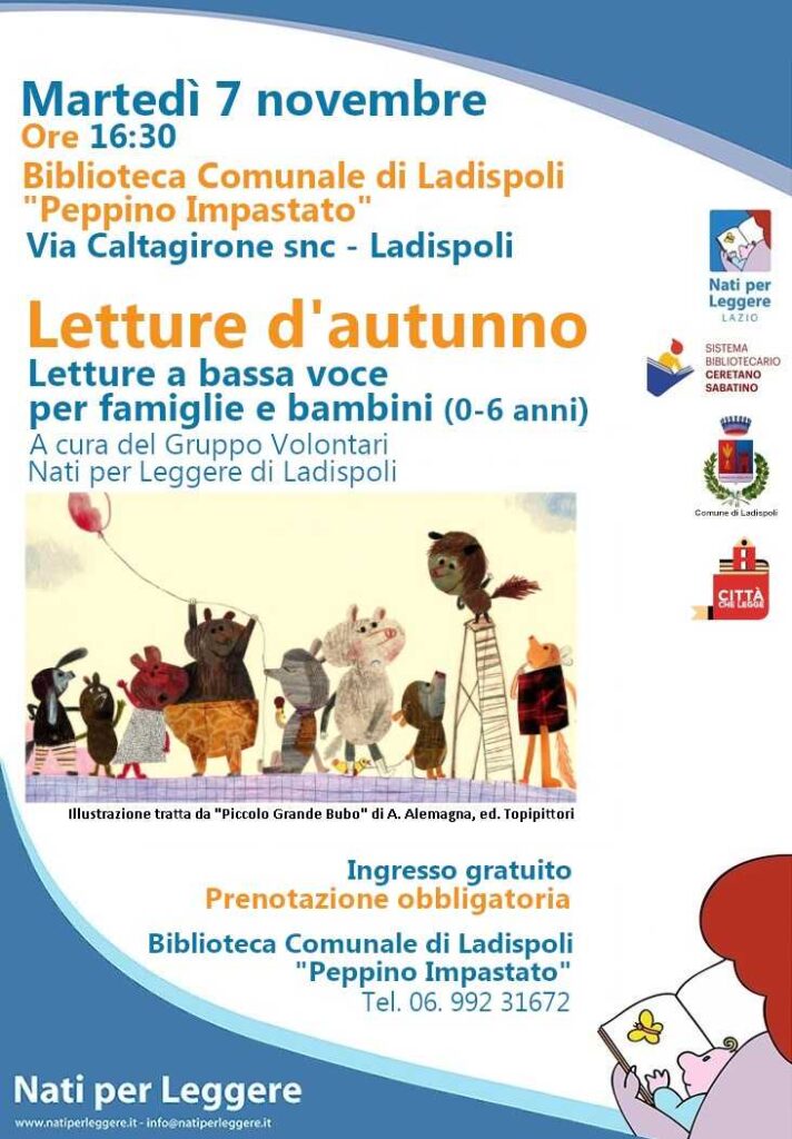 Proseguono le letture a bassa voce per bambini da 0 a 6 anni a cura del Gruppo Volontari Nati per Leggere di Ladispoli presso la biblioteca comunale “Peppino Impastato” Nati per Leggere è il programma nazionale di promozione della lettura, rivolto alle famiglie con bambini in età prescolare, che si preoccupa di spiegare in maniera chiara e scientifica che ogni bambino è nato per leggere, sin dalla più tenera età. Leggere insieme al proprio bambino, tutti i giorni e per pochi minuti, vi permetterà di stabilire con lui un rapporto e un legame importanti, migliorerà la sua vita emotiva e lo sviluppo intellettuale, arricchendo il suo mondo interiore, il suo linguaggio, le sue idee e le sue immagini mentali: un gesto semplice che contribuirà a renderlo un giovane adulto abituato all’ascolto e probabilmente anche un futuro lettore. Il prossimo appuntamento si terrà martedì 7 novembre alle ore 16:30 con Letture d’autunno: l’incontro è dedicato a bambini da 0 a 6 anni, la partecipazione è libera e gratuita ma è necessaria la prenotazione.