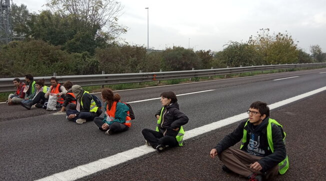 Tre degli undici attivisti di Ultima generazione, che giovedì mattina hanno bloccato la tangenziale di Bologna, sono stati arrestati con le accuse di violenza privata aggravata e interruzione di pubblico servizio. Venerdì alle 10 si svolgerà in Tribunale la direttissima, mentre il movimento ambientalista si riunirà davanti al palazzo di giustizia per un sit-in di protesta. “L’arresto di oggi – fa sapere Ultima generazione – è un attacco alla nostra democrazia. E’ bastata una proposta di legge ad hoc presentata alla Camera a firma della Lega in cui si propone di introdurre un nuovo reato per il blocco stradale, punito col carcere, per sentirne già le conseguenze”. Gli altri 8 ambientalisti sono stati denunciati a vario titolo per interruzione di pubblico servizio, violenza privata, manifestazione non autorizzata, attentato alla sicurezza dei trasporti, danneggiamento in concorso e istigazione a delinquere. Due dei tre attivisti finiti in manette si erano cosparsi le mani con del cemento a presa rapida in modo da rimanere bloccati sull’asfalto e si è reso necessario l’intervento dei vigili del fuoco e dei sanitari del 118 per liberarli. L’arresto per violenza privata aggravata – oltre all’accusa di interruzione di pubblico servizio aggravata – sarebbe dovuto al fatto che i tre attivisti bloccando la tangenziale hanno messo a rischio la loro incolumità e quella degli automobilisti. Inoltre i tre, secondo la Questura, sono ritenuti i promotori dell’azione di protesta e hanno preso parte ad azioni simili in passato. Il movimento ambientalista ha fatto sapere che i tre giovani arrestati sono una ricercatrice universitaria e due capi scout. “Silvia, Mida ed Ettore – scrive in una nota Ultima generazione – sono tutti e tre residenti e inseriti nel tessuto sociale bolognese. Sono persone comuni che hanno deciso di prendere posizione attraverso un atto di disobbedienza civile nonviolenta per il futuro della loro città, denunciando così l’ipocrisia di un governo e di una regione che preferisce fare guadagnare profitti alle aziende autostradali piuttosto che risarcire i propri cittadini dopo una catastrofe”. Tutti e undici gli attivisti sono stati anche sanzionati per blocco stradale. Gli attivisti sono entrati in azione giovedì mattina a Bologna con due manifestazioni di “disobbedienza civile non violenta” sulla Tangenziale e nella sede della Regione. La prima protesta, ha riguardato un blocco stradale che ha avuto inizio alle 8.40 lungo la tangenziale nord di Bologna, in direzione Milano, tra l’uscita 7 bis e 8, dove nove manifestanti hanno srotolato uno striscione arancione con la scritta ‘Fondo Riparazione’ e due di loro, due ragazze hanno incollato le mani sull’asfalto con del cemento a presa rapida. La seconda azione si è svolta più o meno in contemporanea, verso le 8.30 quando tre attivisti sono entrati nel Palazzo della Regione Emilia-Romagna, hanno richiamato l’attenzione con degli allarmi, hanno versato coriandoli sul pavimento, esibendo striscioni con la scritta ‘Fondo Riparazione’, chiedendo ai rappresentanti regionali di riceverli e ascoltarli e interloquendo con la consigliera regionale Piccini prima dell’arrivo delle forze dell’ordine giunte verso le 9.