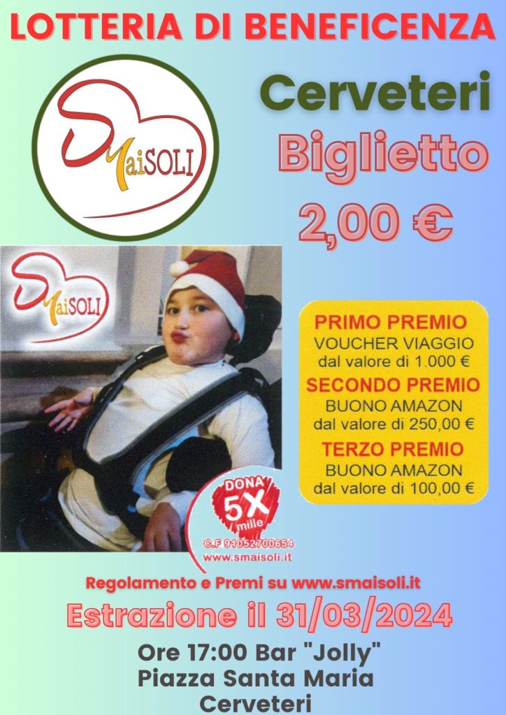 Anche quest’anno è partita la lotteria Smaisoli. Si tratta di una lotteria di beneficienza che ha l’obiettivo di raccogliere fondi per l’associazione che si occupa di dare sostegno alle famiglie con bambini affetti da Sma. L’estrazione sarà il 31 marzo del 2024 al Bar Jolly di Cerveteri e in palio ci sono diversi premi. Il primo è un buono viaggio del valore di 1000 €, mentre secondo e terzo sono due buoni Amazon rispettivamente da 250 € e 100 €. E’ possibile acquistare i biglietti in molte delle attività della città etrusca, il costo è di soli 2 €.