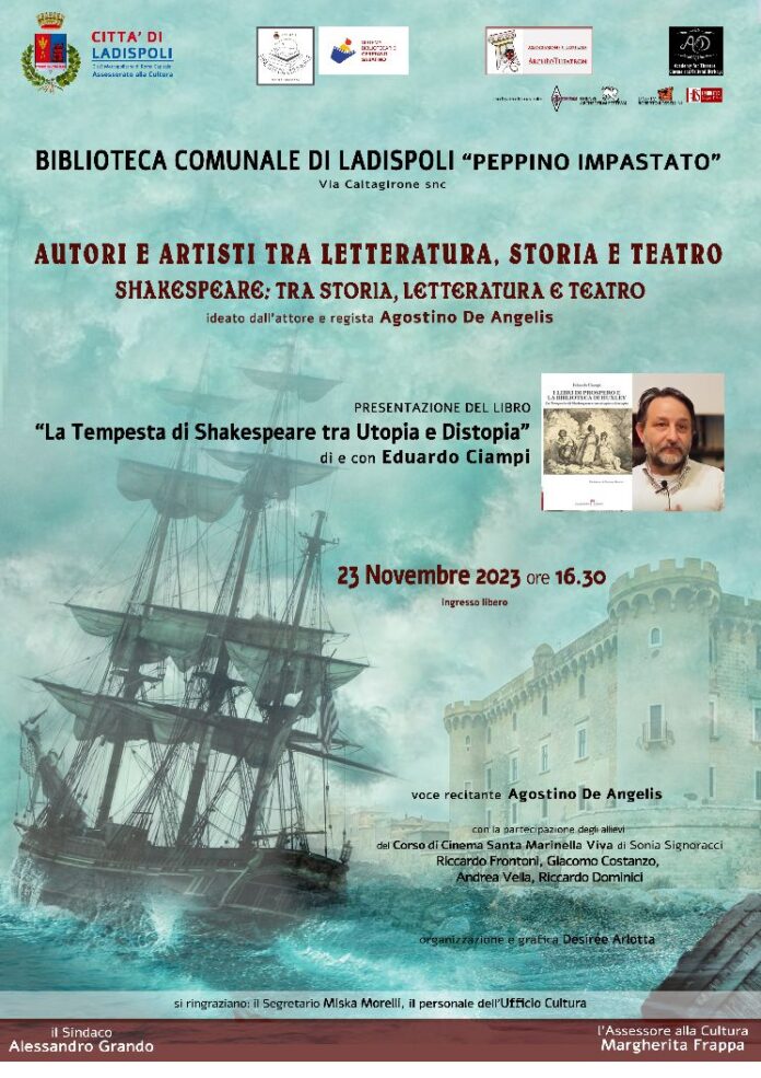 Giovedì 23 Novembre alle ore 16.30 con ingresso libero, nella Biblioteca Comunale “Peppino Impastato” di Ladispoli sarà presentato un progetto culturale ideato dall’attore e regista Agostino De Angelis dal titolo “Autori e Artisti tra Letteratura, Storia e Teatro” tutto dedicato alle diverse forme d’arte, promosso dal Comune di Ladispoli, Assessorato alla Cultura in collaborazione con la Biblioteca e organizzato dall’Associazione Culturale ArchéoTheatron. Il primo appuntamento sarà un omaggio a Shakespeare, con la presentazione del libro di Eduardo Ciampi “La Tempesta di Shakespeare tra utopia e distopia” (Edizioni Casadeilibri, 2022), autore noto per le numerose pubblicazioni sulle opere di Shakespeare ma anche come saggista, bibliografico, traduttore e articolista di altri autori. Il saggio che sarà presentato, tratterà l’ultima opera teatrale di Shakespeare, gli elementi utopici presenti nella sua trama e alcuni aspetti della vita e dell’opera di Aldous Huxley. L’indagine tende a far luce sul significato profondo della drammaturgia shakespeariana e sulla controversa personalità dell’autore della celebre distopia Il Mondo Nuovo. Tra le righe del presente studio traspare come, soprattutto nel corso degli ultimi vent’anni, la società moderna sia riuscita impercettibilmente, ‘dolcemente’ – e inesorabilmente – a sovvertire la visione tradizionale del mondo. L’uomo ha finito per l’accettare supinamente, un insieme di nuovi criteri e nuovi valori, senza imposizioni, coartazioni violente o radicali innovazioni normative, proprio come prevedeva – o forse addirittura si auspicava – Huxley. In tale contesto, la lettura parallela della via della magia bianca di Prospero – mostrata drammaturgicamente da Shakespeare – e quella dell’intellettuale moderno, incarnata da Huxley, lasciano al lettore molteplici elementi di discernimento e di riflessione. Nella presentazione e lettura dei testi insieme a De Angelis, saranno coinvolti alcuni giovani allievi, Riccardo Frontoni, Andrea Vella, Giacomo Costanzo e Riccardo Dominici, del Corso di Cinema Santa Marinella Viva di Sonia Signoracci; curatrice dell’evento Desirée Arlotta.