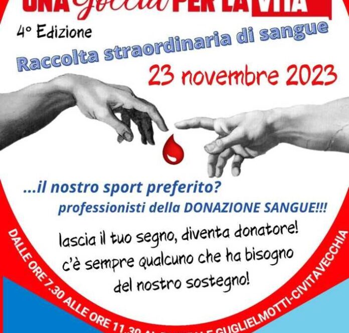 Giovedì 23 novembre, in piazza Guglielmotti, dalle 7:30 alle 11:30 torna l’autoemoteca in piazza per la quarta edizione di “Una goccia per la vita”, la giornata straordinaria dedicata alla donazione del sangue e all’informazione dei cittadini istituita dall’Amministrazione comunale di Civitavecchia. Come ricorda la consigliera Elisa Pepe, promotrice dell’evento, i comitato dell’Avis Civitavecchia, con il comitato Croce Rossa Italiana, raccoglieranno il sangue dei cittadini che si sono prenotati telefonando al 389 3427776 e di tutti quelli che accorreranno il giorno stesso presso il furgone-laboratorio attrezzato per il prelievo del sangue. Ricordiamo che, tra le altre cose, è necessario essere a digiuno dalla sera precedente (al mattino è possibile bere tè o caffè non zuccherati) e non aver avuto malattie infettive o assunto antibiotici negli ultimi quindici giorni.