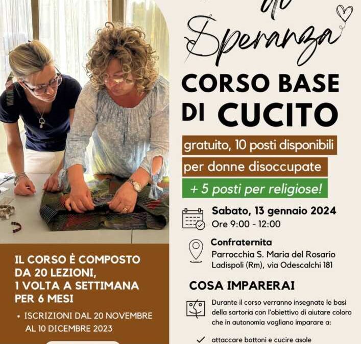 A Ladispoli arriva “Fili di speranza”, corso realizzato in collaborazione con la Caritas di Porto-Santa Rufina e Ciofs Fp Lazio, con il patrocinio del Comune di Ladispoli. Un vero e proprio laboratorio pratico: 60 ore, articolate su 20 incontri svolti in presenza il sabato mattina, in cui si esplorerà l’arte del cucito, partendo dalle nozioni base delle riparazioni e del restyling, fino ad arrivare a confezionare semplici capi di abbigliamento o accessori, che saranno presentati durante la cerimonia di fine corso. In totale sono 10 i posti disponibili per partecipare gratuitamente alle lezioni, che si terranno nella sala parrocchiale di S. Maria del Rosario, con accesso in via Odescalchi 181. Non sono necessarie competenze tecniche di base ma sono indispensabili motivazione e passione per il lavoro sartoriale. In più da quest’anno saranno disponibili cinque posti in più per religiose e consacrate. Agli iscritti verrà rilasciato un attestato di partecipazione, oltre al supporto nella redazione del curriculum e all’attività di accompagnamento nella ricerca di un lavoro. Sarà possibile iscriversi inoltrando la richiesta via mail, all’indirizzo info@terraemissione.org, a partire dal 20 novembre fino al 10 dicembre, mentre i nominativi delle partecipanti saranno resi pubblici in occasione della cerimonia di inaugurazione del corso, che si terrà sabato 16 dicembre alle ore 16. Le lezioni inizieranno il 13 gennaio 2024. Per informazioni, è possibile telefonare al numero 347.0300998 dal lunedì al venerdì dalle ore 13 alle ore 14 e dalle ore 17 alle ore 19.