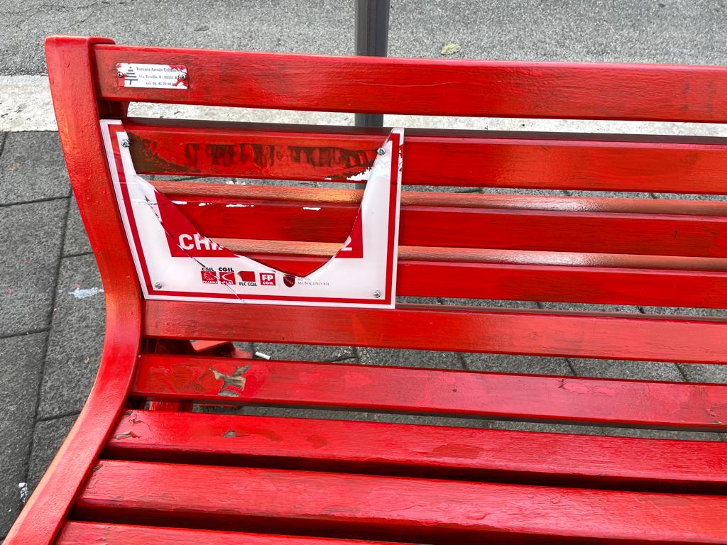 “Adue mesi esatti dall’inaugurazione della panchina rossa contro la violenza sulle donne da parte di Flai Cgil, Filcams Cgil, Flc Cgil, Fp Cgil la targa che presentava il