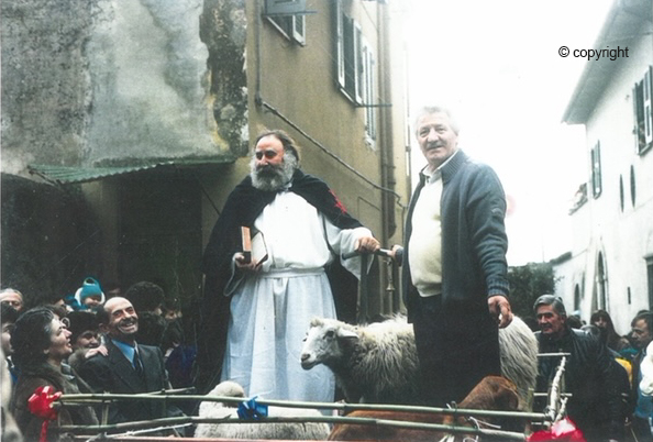 Lunedì diciassette gennaio. Il sole, affacciatosi di lato al Granarone, saettava pavidi raggi sulla Boccetta zeppa di animali,barrozze,calessi, fumanti lambrette e moto, mucchi di gente e ragazzini. Labbra screpolate, geloni ai diti, calzettoni e guanti di lana, cappelli con copri orecchie che facevano rissomiglià i ragazzini a segugi, scarponi chiodati che scivolavano sui sampietrini umidi. Balle di fieno, come improvvisati recinti, a contenere vacche, pecore ed inquieti maremmani in attesa della benedizione. I cavalieri in groppa a cavalline nervose ed impazienti col mocciolo alle sbuffanti froge, annusando di già il fremito del passaggio per via dei Bastioni tra l’eccitazione dei compaesani. Sant’Antonio il lottatore, il Prometeo con a fianco il roseo maialino con campanella al collo, era festeggiato dai cervetrani da antica data: la chiesetta gli era stata dedicata in un lontano giorno del primo quarto del secolo diciottesimo. A memoria documentabile, e non a chiacchiere, la festa del Santo che si rintana nel deserto abbandonando il mondo reso viscido ed immondoa causa della ricerca forsennata della ricchezza e del potere con conseguente corruzione e ipocrisia, la festa dell’eremita sant’Antonio Abate, si rincorre per le antiche e strette vie di sampietrini da circa tre secoli. Certamente, dopo la festa dell’ottomaggio, quella dedicata a san Michele Arcangelo che con la nebbia e lo spadone allontanò i predatori sbarcati alla marina, la ricorrenza del diciassette di gennaio fa battere a mille l’animo della Comunità. Non è inventata quindi, non è una sagra , ma tradizione avita, storica , partecipata . Mai come in questo caso l’uso del termine Festa popolare ci sta tutto. Il Maresciallo Saporito in grande uniforme, lasciato il suo fedele lupo alsaziano in mezzo ad una canizza dalle infinite razze che scompostamente cercavano un capo branco, stava affacciato, assieme al brigadiere ed a don Luigi,circondato da tre quattro chirichetti, dal muretto a mattoncini rossi della chiesetta antica. Il laterizio a spina di pesce, inverdito dal vellutello, ostentava l’usura degli anni,mentre le pietre di templi molto più antichi, incastrate a sostegno di nuove case, o a difesa degli spigoli, sapevano di senso materno. Accarezzarle confortava e riscaldava l’anima. Poi, come se storce il collo al pollo, la lunga e confusionaria fila di omini e bestie si mosse dal largo della Boccetta verso piazzetta Verdi, e da lì nello stretto budello che porta alla benedizione. Come al canapo di Siena le discussioni, le occhiatacce, le sculate di quarti d’animale, i dispetti si sprecavano. Solamente la presenza severa delle guardie Giovanni, Giggetto e Menicuccio, veterani dell’ordine pubblico, li costringeva ad abbozzare. Struscianti chiodi e zoccoli sui sampietrini coperti da lingue di ghiaccio, ossequiano al santo, mentre don Luigi li spruzza, ripetendo incomprensibile e sempre più biascicata frase in latino. Tutti, cani, vacche e cavalli, greggi e cavalieri accennano ad inchino. Campanelli e fiocchetti colorati si muovono al ritmo dei quadrupedi. La canizza, guidata da un orgoglioso lupo alsaziano sembra non avere fine. Poi, inaspettati, con andatura da mal di mare, vecchi e pelosi dromedari del circo Elmer, infiocchettati in amaranto, allungano il collo tra la folla, sospinti da un infreddolito fustigatore in giacchetta rossa dai bottoni e martingala dorati. Il circo, in quel freddo inverno del cinquantasei, aveva preferito fare una lunga sosta in paese, in attesa che “sbrinasse”. Da anni piazzavano le due carovane in legno, sedie, trapezi e reti ed uno sdrucito tendone, di fronte alla cabina, tanto da essere considerati de casa. Le compartecipazioni dei cervetrani agli spettacoli circensi, dall’uomo forzuto alla voce narrante di incredibili bugie e barzellette erano oramai una costante, tanto da riuscire difficile distinguere lo spettatore dall’attore. Chiusero la sfilata i ragazzini con in braccio abbacchietti, cagnolini,mici ed infreddolite tortore, galletti e piccioni sballottati nelle gabbie. Si muovono, si intruppano, si spingono, accennano a correre, ma sotto al Santo ritrovano un ordine da “Piave mormorò” pel quattro novembre al Monumento.