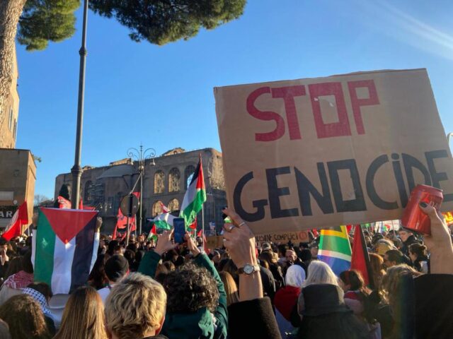 “Stop al genocidio del popolo palestinese: 9mila bambini uccisi, 22mila morti e 109 giornalisti uccisi”. Con questo slogan diverse centinaia di persone sono tornate in piazza oggi a Roma per manifestare contro l’offensiva di Israele a Gaza. Tra largo Corrado Ricci e via dei Fori Imperiali sventolano bandiere della Palestina e della Pace in attesa della partenza del corteo che dovrebbe raggiungere piazza dell’Esquilino. Alla manifestazione promossa dal Movimento studenti palestinesi in Italia, Udap (Unione democratica arabo palestinese) e Api (Associazione dei palestinesi), hanno aderito tra gli altri i collettivi universitari, l’Osa, i movimenti di lotta per la casa, Arci e Anpi. “In queste ore l’offensiva dell’esercito israeliano contro Gaza continua senza tregua – si legge sui volantini distribuiti in piazza – I bombardamenti colpiscono indiscriminatamente la popolazione civile, bambini, operatori sanitari, giornalisti. Oramai sono oltre 23mila le vittime, purtroppo il numero è destinato a crescere nei prossimi