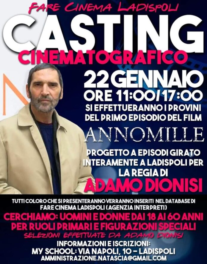 Il prossimo 22 gennaio a partire dalle ore 11 alle ore 17, si effettueranno i provini del primo episodio del film “Annomille”. Un progetto a più puntate girato interamente nella citta di Ladispoli, per la regia di Adamo Dionisi, tutti quelli che si presenteranno saranno inseriti nel database di “fare cinema Ladispoli”, possono presentarsi uomini e donne di età compresa tra i 18 e 60 anni, le selezioni saranno effettuate dallo stesso Adamo dionisi per ruoli priomari e figurazioni speciali. Informazioni e iscrizioni: My school, Via Napoli, 10 Ladispoli