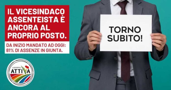 Ladispoli Attiva contro il Vicesindaco: “Assenteista” –“Lo scorso luglio avevamo posto all’attenzione dei cittadini la storia di Annibale Conti, vicesindaco del Comune di Ladispoli, in quota Fratelli d’Italia, che da inizio mandato in pochi hanno visto frequentare Palazzo Falcone”.Lo si legge in un comunicato ufficiale diffuso da Ladispoli Attiva.“A nostra domanda durante il consiglio comunale del 26 luglio 223, il sindaco, visibilmente imbarazzato, aveva promesso che – da lì a poco – sarebbe stata presa una decisione sul suo conto. Sono passati 6 mesi, ma il vicesindaco continua ad essere al proprio posto continuando a collezionare veri e propri record di assenze.Da inizio mandato ad oggi – infatti – su 467 delibere licenziate dalla giunta comunale, il Conti ha collezionato ben 381 assenze, pari all’81% sul totale delle deliberazioni. Una vera e propria mancanza di rispetto nei confronti di una città che nonostante questa sua scarsissima partecipazione, dal 2022 ad oggi, gli ha già liquidato oltre 28 mila euro di compensi. Sin dall’inizio della sua avventura politica nel nostro ente in molti avevano riposto riserve verso questa scelta: un uomo calato dall’alto dei palazzi romani, con altri incarichi (e compensi) in Regione Lazio e soprattutto completamente avulso dalla realtà di Ladispoli.