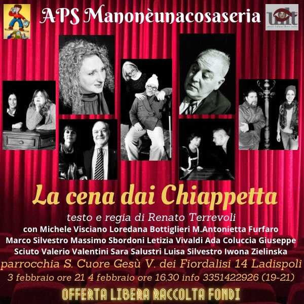 “Sabato 3 febbraio alle ore 21,00 e domenica 4 febbraio alle ore 16,30 in via dei Fiordalisi 14 a Ladispoli, avrà luogo lo spettacolo teatrale “La cena dai Chiappetta” presso la sala teatrale della parrocchia Sacro Cuore di Gesù. Una esilarante commedia in due atti con protagonista un ingegnere alla disperata rcierca di una promozione di lavoro. Felice Chiappetta, questo è il suo nome, dovrà vedersela con una moglie bisbetica, un vicino invadente, due figli rivoluzionari, due suoceri impresentabili e una cameriera burlona. Riuscirà il nostro eroe ad ottenere la promozione? Venite a scoprirlo. L’evento è realizzato dalla APS “Manonèunacosaseria”, l’associazione di Promozione Sociale è stata istituita con l’intento di praticare, promuoivere e diffondere la cultura e l’arte del teatro ispirando la sua attività ai valori umani, è iscritta al Registro Unico del Terzo Settore – Regione Lazio, all’albo comunale e alla Unione Libero Teatro Italiano. I soci sono animati da una grande passione per il teatro che li coinvolge nelle varie fasi della ralizzazione di uno spettacolo: dalla scrittura del testo alla messa in scena, passando per le prove, la scenografia, i costumi, il trucco, le luci, la regia, tutte persone che amano il teatro e che si divertono a farlo, si emozionano e tentano di emozionare il pubblico. Lo spettacolo è a ingresso libero con raccolta fondi a favore dell’APS, per ulteriori informazioni si può contattare il 3351422926 (dalle 19 alle 21)”.