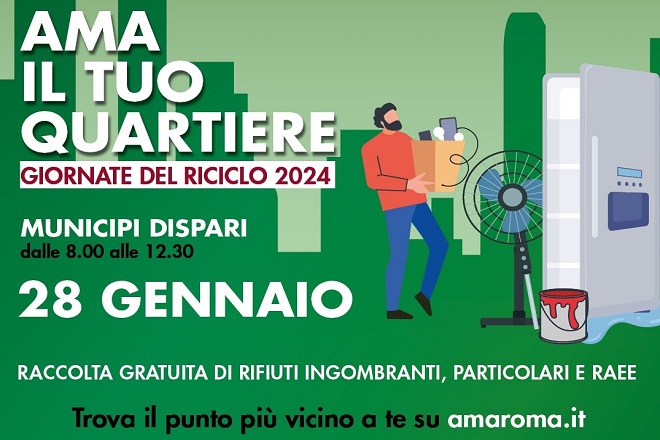 In programma domani, domenica 28 gennaio, la nuova edizione dell’iniziativa “AMA il Tuo Quartiere – Giornate del Riciclo”, organizzata per il 25° anno consecutivo da AMA in collaborazione con il TGR Lazio. In questo primo appuntamento del 2024 saranno coinvolti gli 8 municipi dispari della Capitale, dove saranno complessivamente allestite 15 “eco-stazioni” di raccolta. Anche i Centri di Raccolta fissi aziendali saranno aperti e a disposizione dei cittadini di mattina, compresi quelli dislocati nei municipi pari. L’iniziativa, dal 2000 ad oggi, ha consentito ai romani di consegnare oltre 43mila tonnellate di materiali e beni dismessi. A partire dalle 8, i cittadini potranno consegnare nelle “eco-stazioni” appositamente allestite i “classici” rifiuti ingombranti (ad esempio mobili, sedie, letti, divani, scaffalature, materassi, ecc.), oltre ai cosiddetti RAEE (rifiuti di apparecchiature elettriche o elettroniche come computer, televisori, stampanti, telefonini, tablet, frigoriferi, lavatrici, condizionatori). I materiali raccolti verranno differenziati secondo la categoria merceologica (legno, ferro, plastica, altri metalli, RAEE, ecc.) e avviati alle rispettive filiere di recupero. Saranno consentiti, con il supporto della Polizia Locale di Roma Capitale, accessi scaglionati per regolare il flusso di veicoli e persone. AMA invita, quindi, i cittadini a recarsi sul posto entro le ore 12:30, in modo da consentire a tutti di usufruire del servizio. Nelle aree di piazzale Clodio (I Municipio), via Anagnina (VII Municipio) e via Vincenzo Tieri (XV Municipio), saranno posizionate in aggiunta 3 “Stazioni mobili per la raccolta differenziata” presso cui i cittadini potranno conferire anche oli vegetali esausti, pile, batterie e contenitori con residui di vernici e solventi. Queste “stazioni mobili” fungeranno anche da punti informativi per gli utenti.  Anche in questa edizione, agli appuntamenti in calendario parteciperanno, in alcuni siti, i volontari di associazioni, cooperative sociali e organizzazioni del Terzo Settore che promuovono progetti volti al riutilizzo dei beni usati e con le quali AMA ha siglato specifici protocolli di intesa. In particolare, nell’appuntamento di domani, sarà presente il gruppo dei Ciclonauti. I volontari saranno a disposizione dei cittadini presso le postazioni di pazzale Clodio (I Municipio), via Francesco Tovaglieri (V municipio) e via Anzio (VII municipio) per la raccolta di vecchie biciclette o parti di esse.