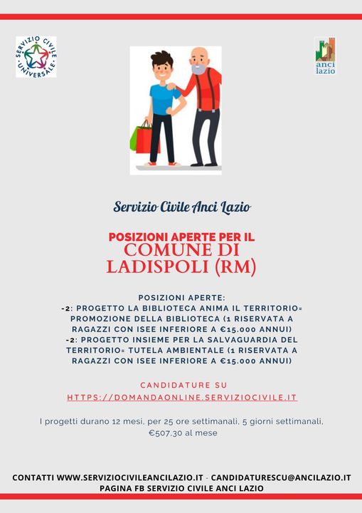 E’ possibile presentare la candidatura per i progetti di Servizio civile Anci Lazio 2024 al Comune di Ladispoli. Le posizioni disponibili riguardano la biblioteca e la tutela del territorio, ciascun progetto dura 12 mesi, per un impegno di 25 ore settimanali suddivise in 5 giorni per una somma di 507,30 euro mensili.