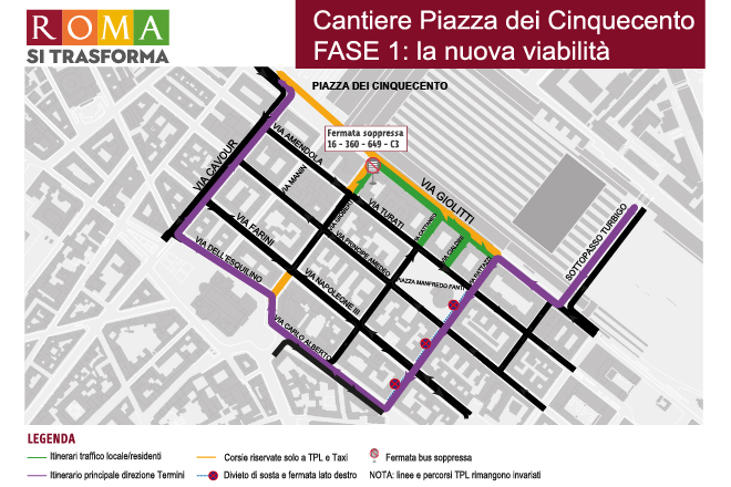 Partiti il 22 gennaio i lavori per il Giubileo che prevedono la riqualificazione urbana di Piazza dei Cinquecento e delle aree adiacenti alla Stazione Termini. Questo comporta alcune modifiche alla viabilità e alle fermate bus nell’area intorno a via Giolitti. Le variazioni, che dureranno fino alla fine delle lavorazioni, permetteranno l’esecuzione dei lavori ed al termine restituiranno lo spazio antistante al principale snodo ferroviario della Capitale completamente riqualificato, anche in termini di sicurezza e decoro. L’opera ha un costo di 18 milioni di euro (finanziati dal Mit) ed è frutto di un concorso di progettazione di FS Sistemi Urbani, società capofila del Polo Urbano del Gruppo FS Italiane e il soggetto attuatore dell’intervento è Anas (Società del Polo Infrastrutture del gruppo Fs Italiane). Via Giolitti è la strada maggiormente interessata dai cambiamenti, che influiranno sulle strade limitrofe. I sensi di marcia, con opportune segnalazioni che sono già state apposte nei giorni precedenti, verranno modificati. Per l’attuazione del nuovo piano di viabilità, saranno istituiti divieti di fermata in particolare nel tratto di via Giolitti, da via Rattazzi a Piazza dei Cinquecento che sarà riservato al trasporto pubblico locale. Ad eccetto di TPL e Taxi, per i veicoli provenienti dal sottopasso Turbigo sarà obbligatoria la svolta a sinistra, una volta giunti all’intersezione con via Rattazzi. In conseguenza di tali limitazioni, c’è su via Gioberti una nuova disciplina di traffico che limita l’accesso ai mezzi privati su alcuni tratti della strada, in direzione di via Giolitti, con eccezione del traffico locale. Per consentire il transito veicolare nell’area, ci sono dei cambi dei sensi di marcia e svolte obbligate in Piazza Manfredo Fanti, via Carlo Cattaneo, via Enrico Cialdini, Piazza di santa Maria Maggiore, via Farini e via Amendola. La Polizia Locale di Roma Capitale ha predisposto un piano rafforzato di vigilanza che prevede, fino al graduale accoglimento del nuovo piano viario, l’impiego di oltre 50 agenti ogni giorno. Con l’avvio dei lavori di riqualificazione di piazza dei Cinquecento e per fare spazio al cantiere, il capolinea dei bus viene modificato. Una gran parte resta sulla piazza nello spazio compreso tra la grande pensilina della stazione e via Cavour. La parte restante delle linee bus farà capolinea alle spalle dell’area di cantiere (di fronte agli accessi della metro B) e in viale Enrico de Nicola.