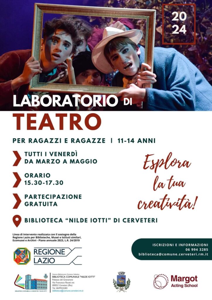 Presso la Biblioteca comunale “Nilde Iotti “sarà attivato un corso gratuito di teatro per giovani dagli 11 ai 14 anni, si inizierà a marzo fino a maggio 2024 tutti i venerdì. Per iscrizioni e informazioni è possibile contattare il numero 06 9943285 o scrivere a biblioteca@comune.cerveteri.rm.it “Grazie a questa opportunità sarà possibile vivere un’esperienza creativa e divertente che prevedrà anche un saggio finale.” a darne comunicazione è Federica Battafarano Vicesindaco e Assessore alla Cultura di Cerveteri